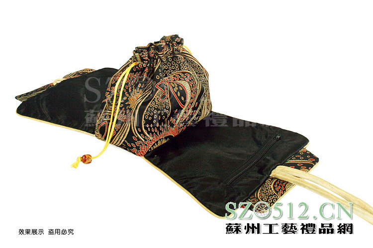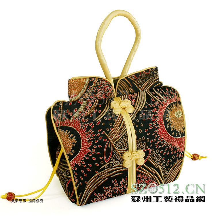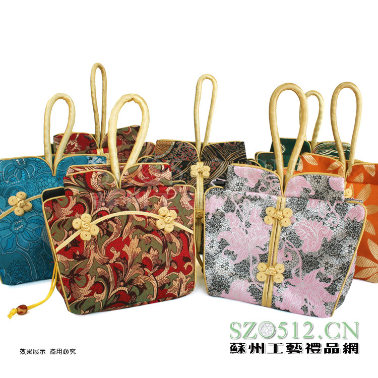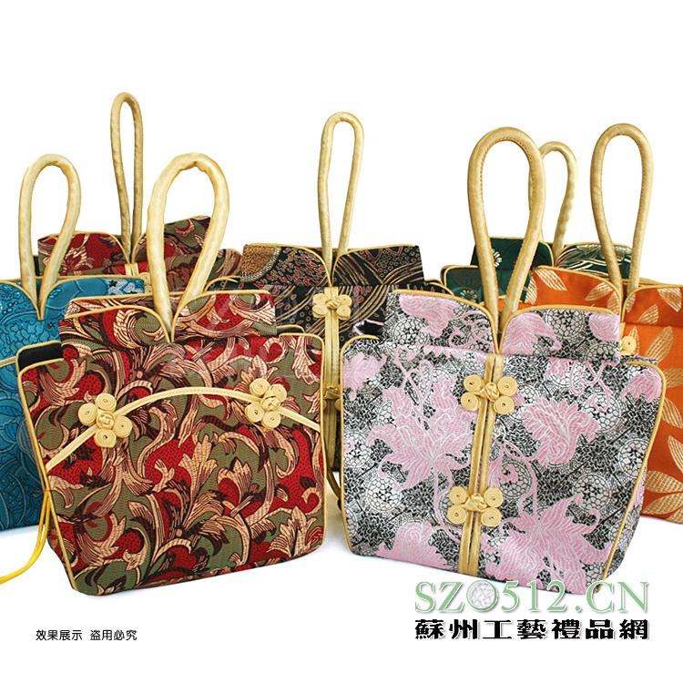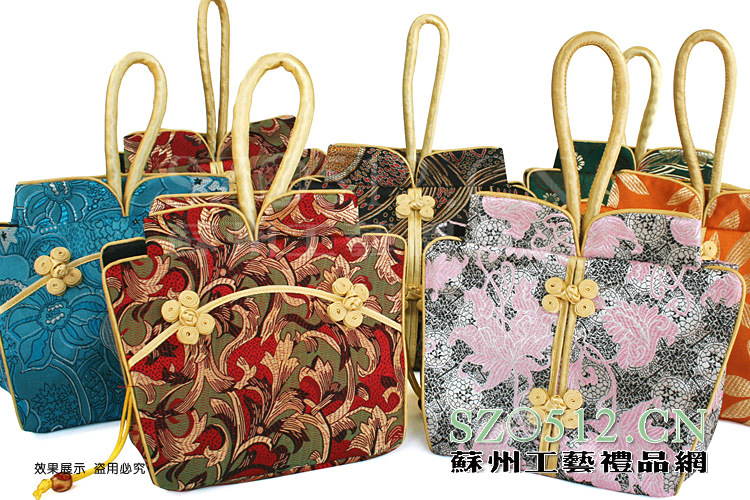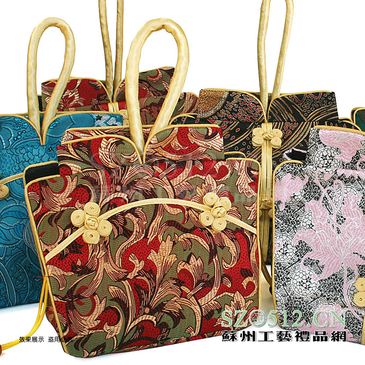 【簡介】:此款織錦小拎包由三個上分體底部連接的三部分組成,正面部分為單片唐裝盤扣衣服款式,中間部分為上面獨立底部連接的可抽束內袋,拎帶部分為底部連接的單片有小拉鏈暗袋,實用又個性的時尚女包,超個性超時尚,舍我其誰~~~