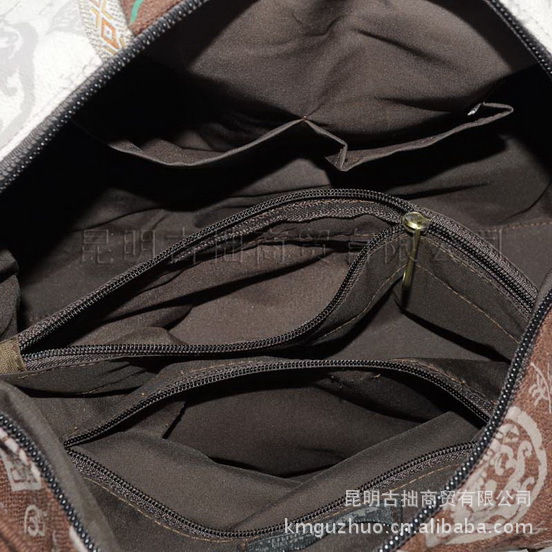 1、民族風印花民族手提挎包即可手提也可斜挎,斜跨包帶高40-70cm,可以自由調節。內部有一個拉鏈隔層袋,一個拉鏈袋和一個卡袋、一個手機袋,包包背麵有1個寬17cm的拉鏈袋。