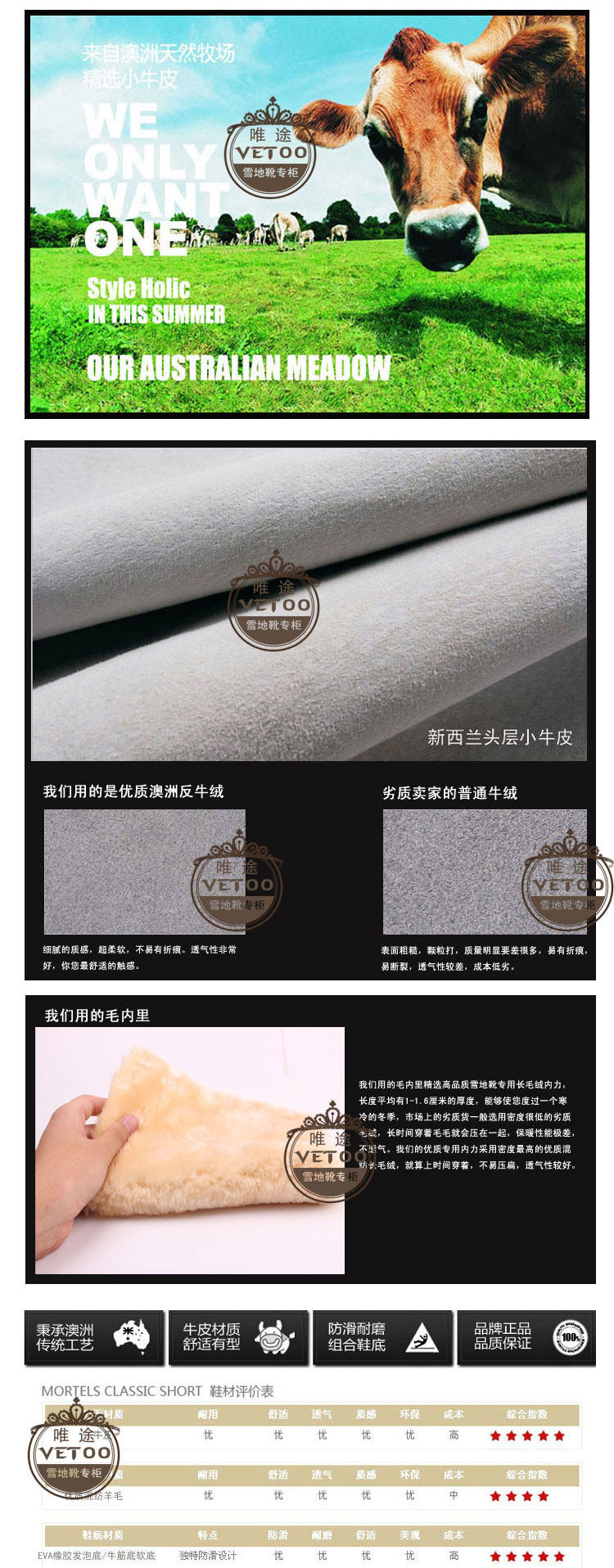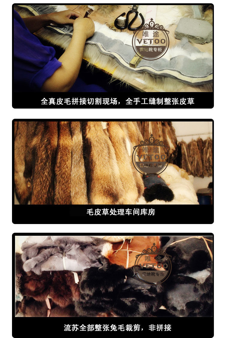 注:狐貍款雪地靴毛口處形似狐貍稱為狐貍款,并非使用真狐貍的毛,而是蘇格蘭北貉品種的皮毛,北貉的皮更厚,毛比狐貍長,保暖又蓬松,而且密度高,用在雪地靴上更能突顯高貴,在網上網友對此類皮草稱為“狐貍毛”并非真狐貍毛。
