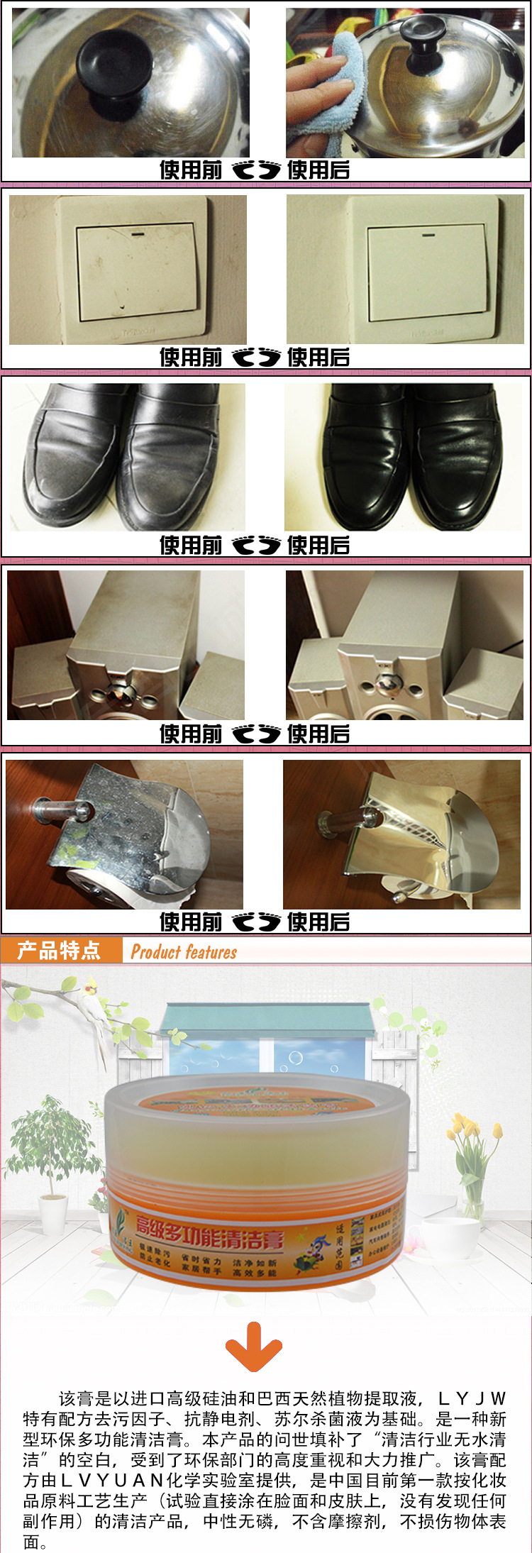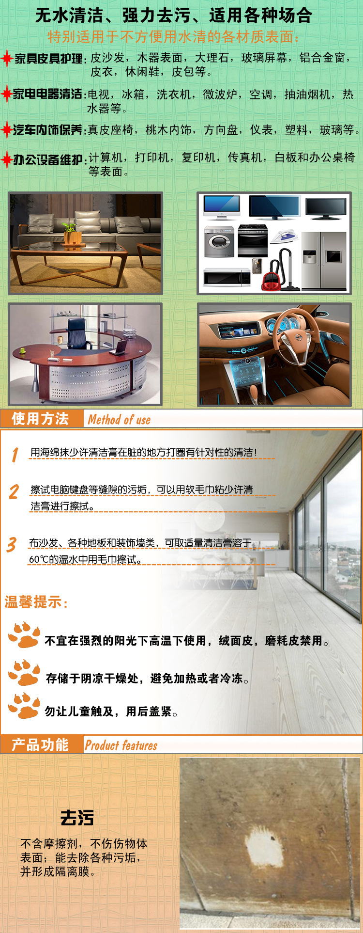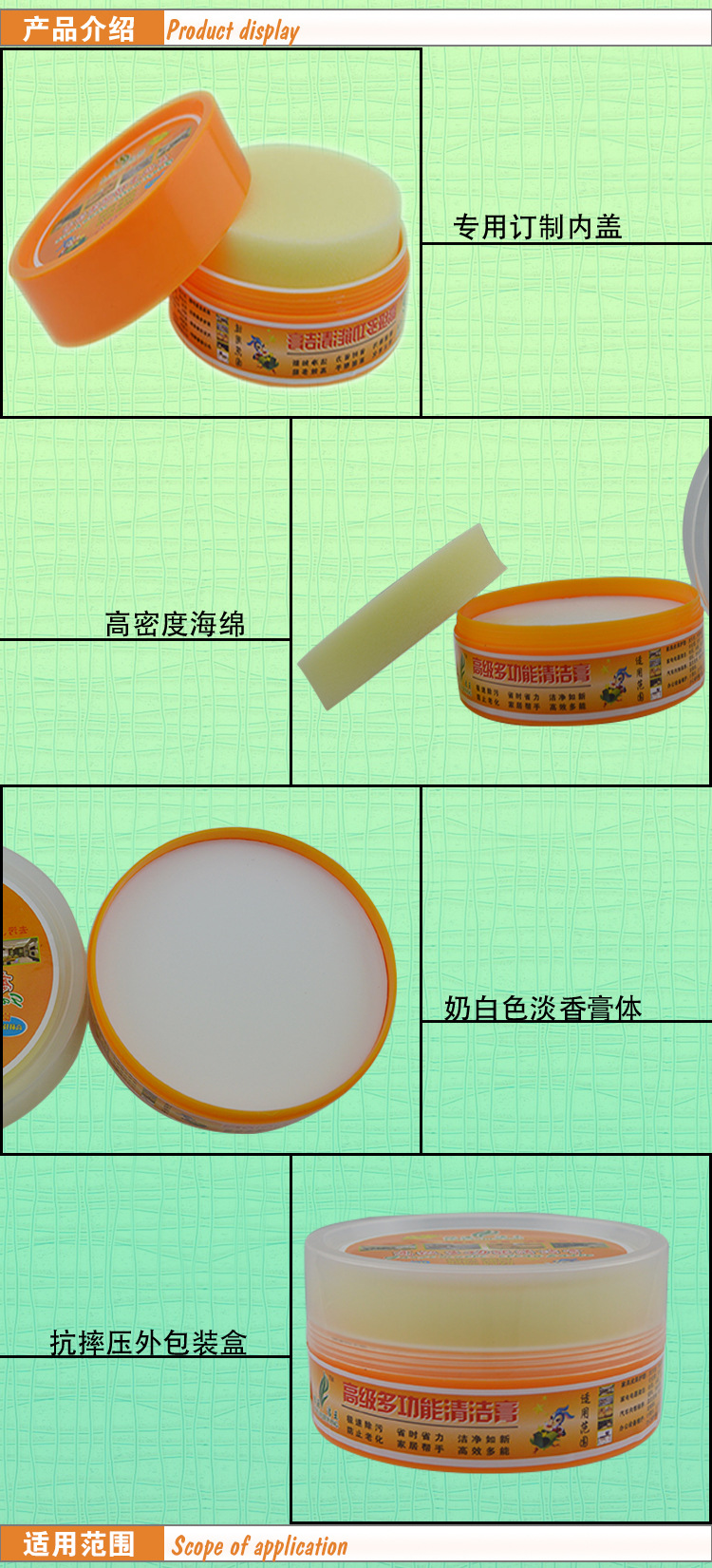 本公司對外承接清潔膏,鞋油,真皮保養油,傢私皮革上光液,上光油.翻絨皮清潔著色劑系列產品、地板精油,地板蠟,汽車蠟,不銹鋼清潔去污膏 油污凈 玻璃清潔劑 汽車璃防水防霧劑,管道疏通劑 洗衣機槽清洗劑,水垢茶漬清除劑,佈藝乾洗劑,羽絨衣乾洗劑 汽車頂蓬乾洗劑 房屋漏水防護系列(墻麵漏水除黴劑、防黴劑)除濕劑、除味劑等相關傢居清潔洗滌類(廚房重油污清潔劑、玻璃防霧清潔劑、不銹鋼清潔劑清潔膏、佈藝乾洗劑)等產品加工生產,貼牌業務!可提供各類產品不同規格的包裝,也可按客戶要求進行生產加工!