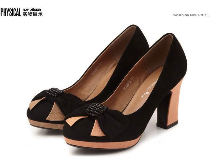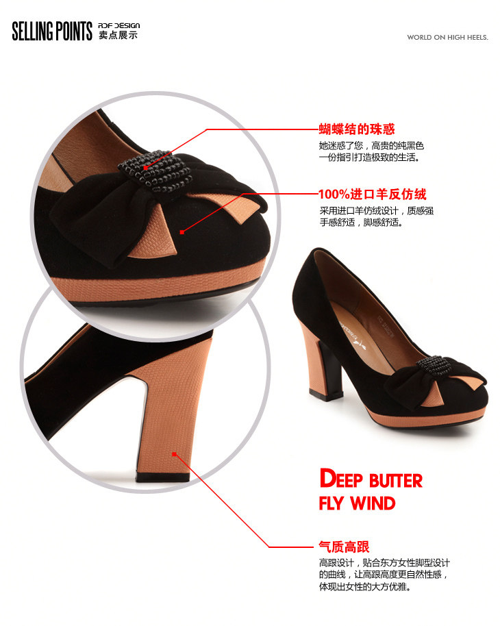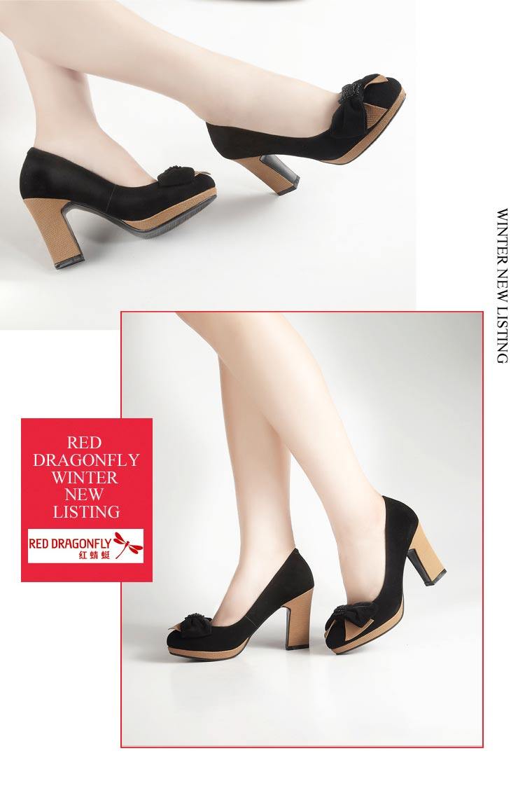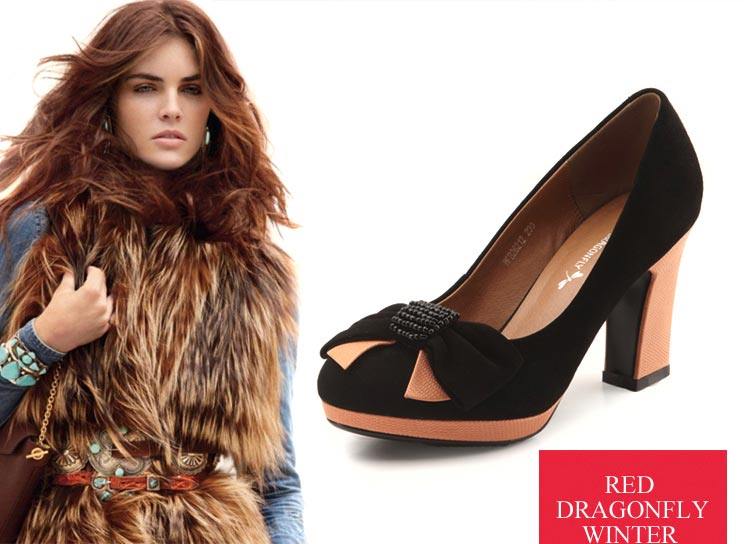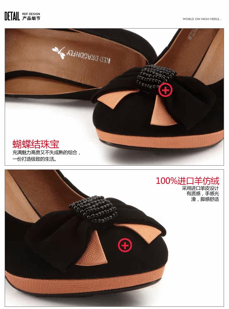 紅蜻蜓 真皮女單鞋 2012秋冬新款正品時尚反絨蝴蝶結防水臺女鞋