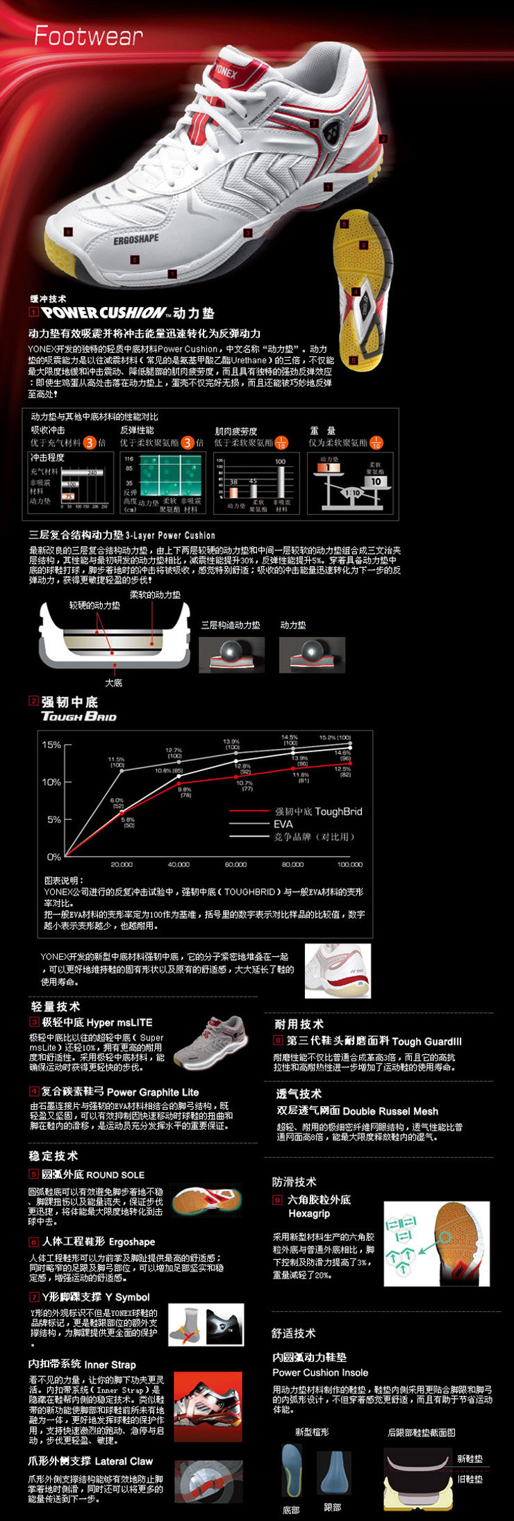 3、 鞋底采用Round Sole圓弧設計,有效防止腳部疲勞,避免著地不穩和能量損耗,防止了腳掌在著地時的側滑,并將更多的能量傳送給下一次的腳步移動,為羽毛球頂級選手提供 了更迅速和更流暢的步伐; 4、Power Cushion雙密度動力墊設計,能大副消減肌肉和關節的疲勞及損傷,讓您移動更加輕盈靈活??