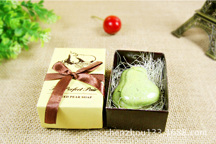 當精美的緞帶紮著的禮品盒一打開,一對完美的梨形香皂顯露在眼前,它的美麗震驚瞭您的客人,讓您的客人相信,那是真的!