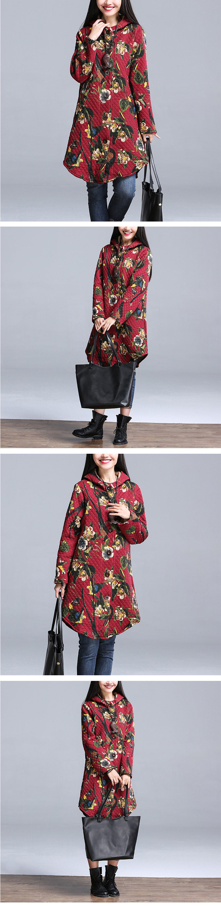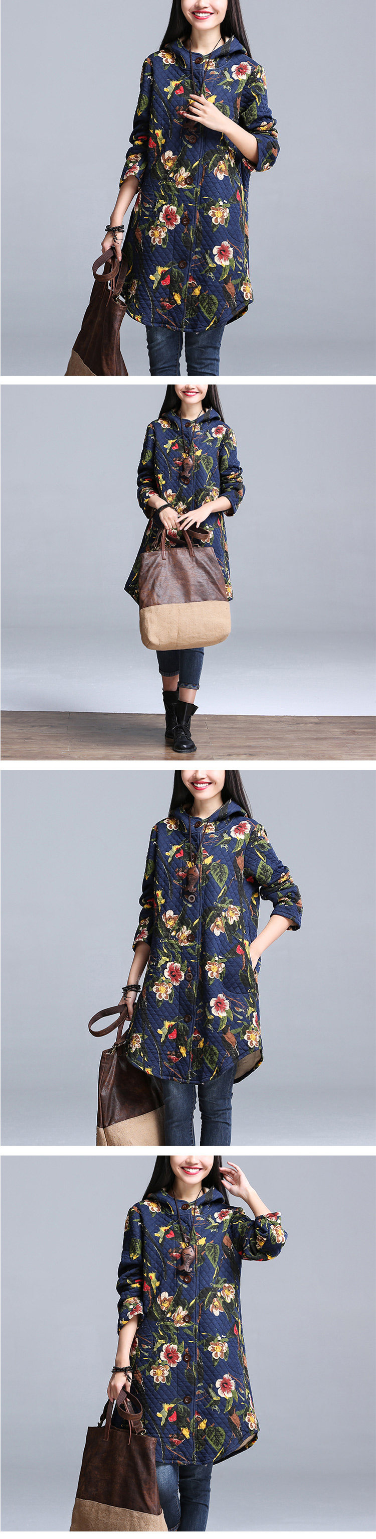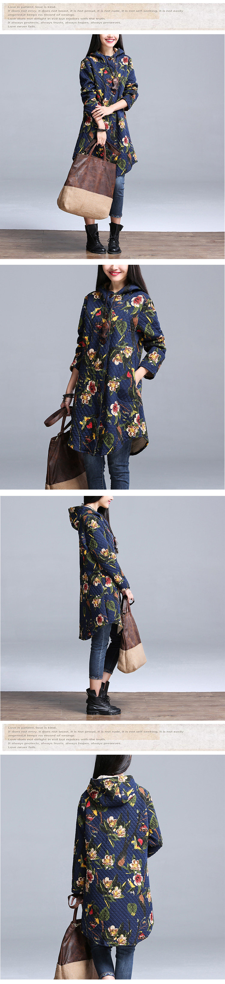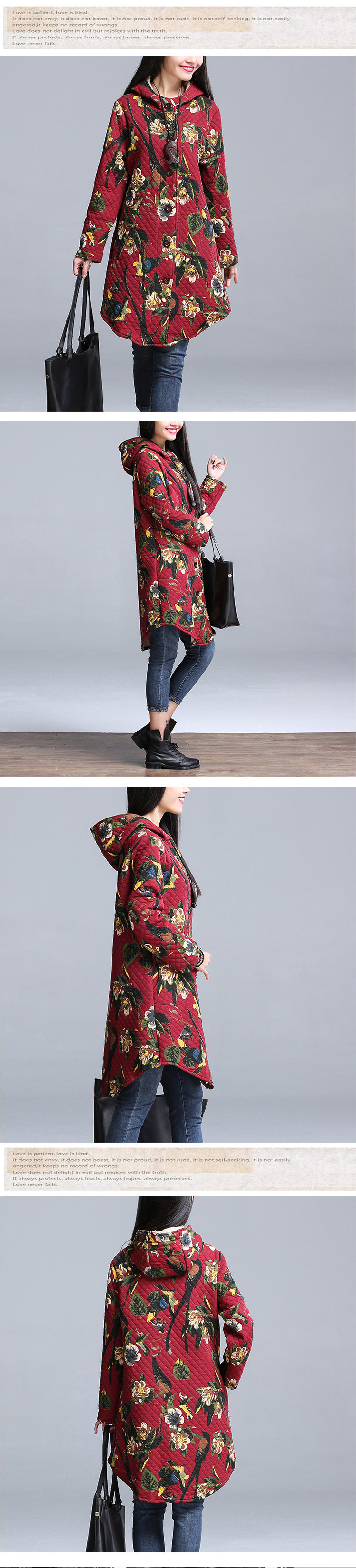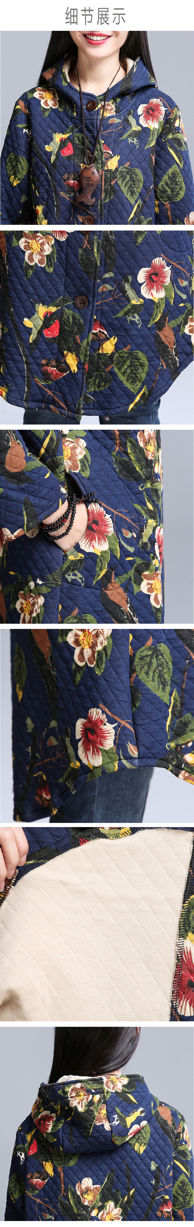 外貿秋冬新款民族風女裝 大碼中長款印花夾棉寬松連帽棉麻外套女