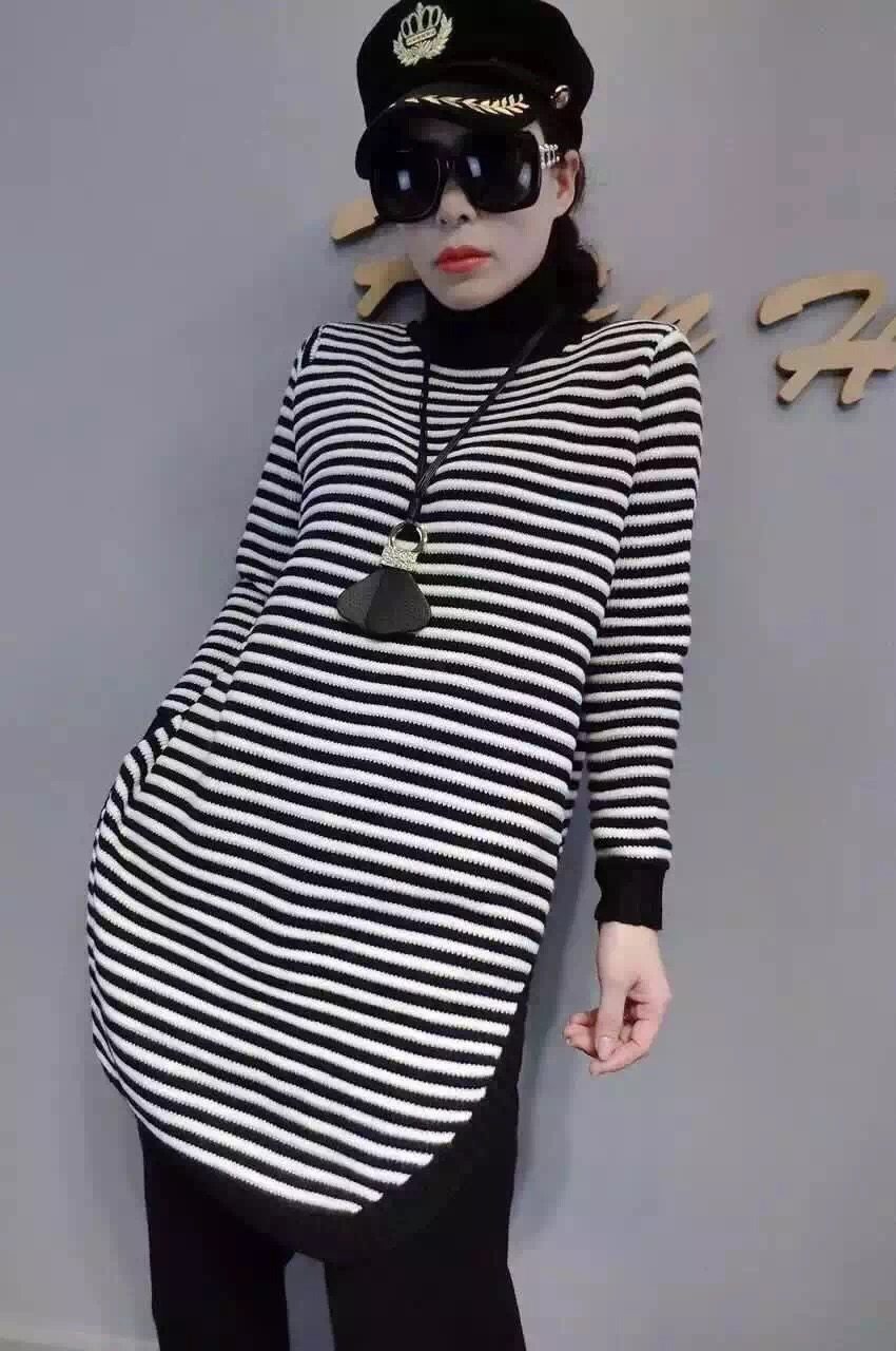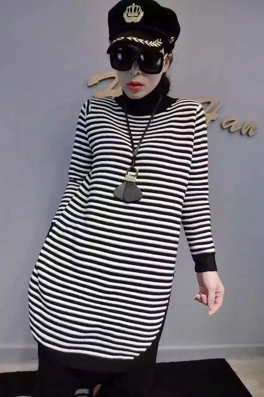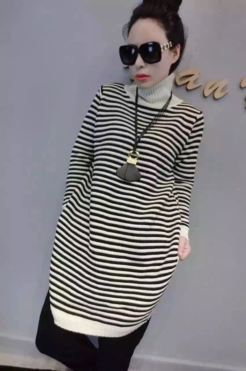 2015秋冬新款韓版時尚條紋高領側開叉長款毛衣針織衫