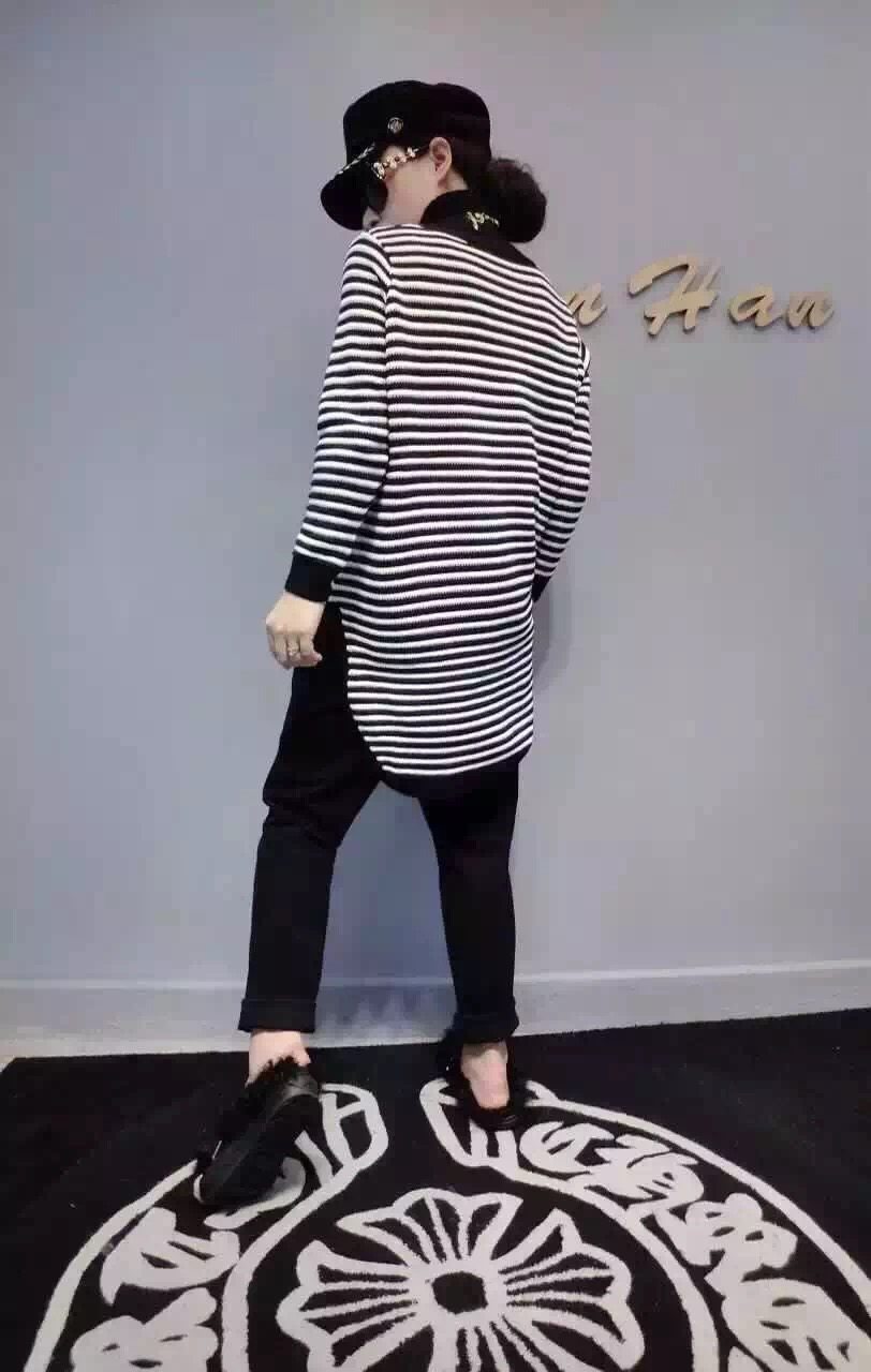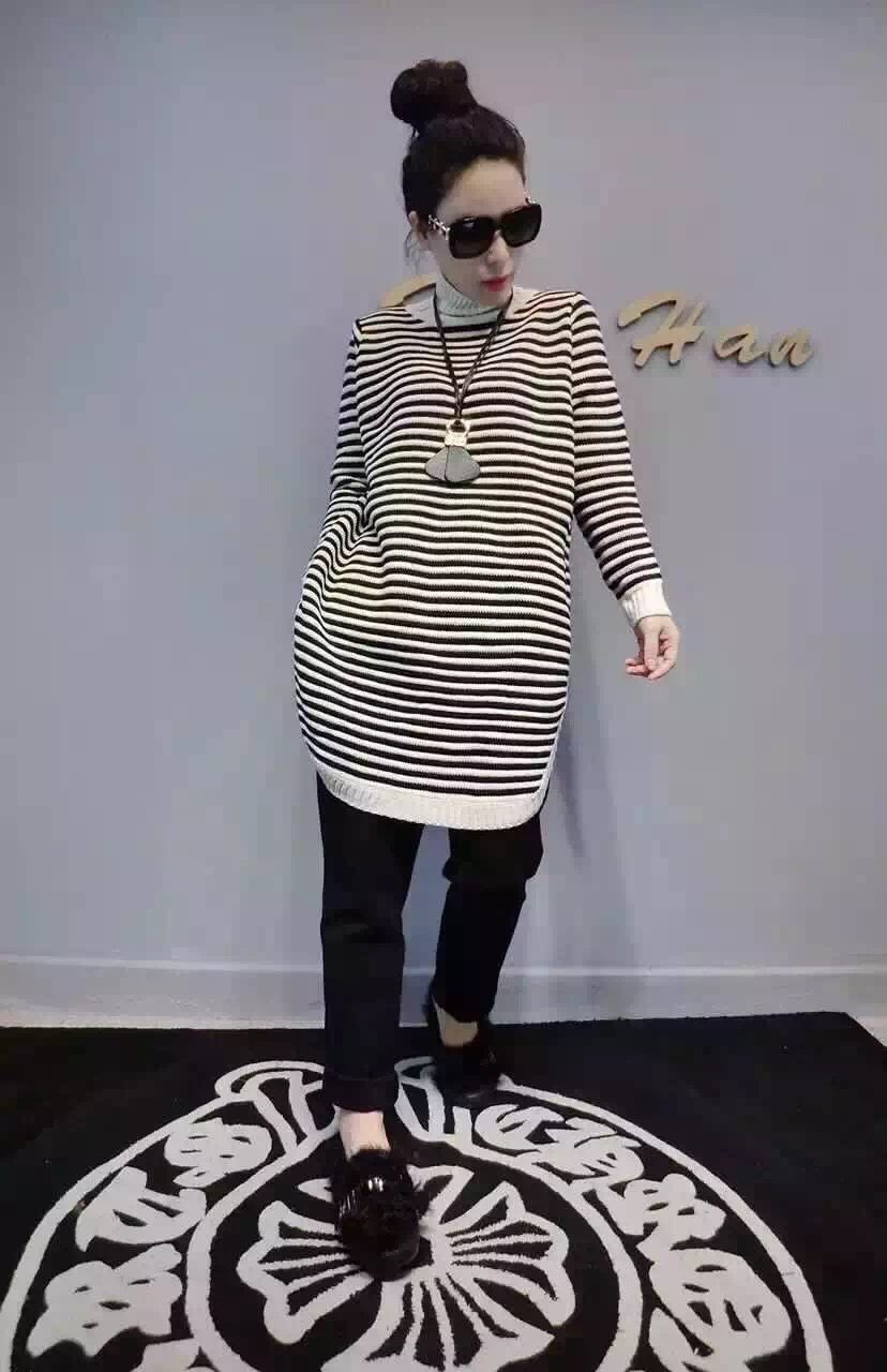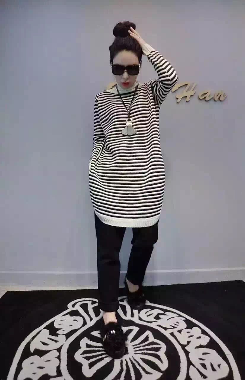 2015秋冬新款韓版時尚條紋高領側開叉長款毛衣針織衫