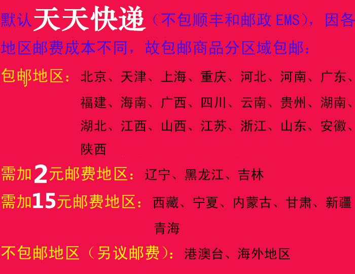 我們每天統一時間準時發貨,超過時間次日發貨,如果有特殊要求的,請及時聯系客服協商解決.請各位買傢在收貨的時候當著快遞人員的麵簽收商品.如有漏損請及時聯系我們好給予解決. 本店默認用匯通快遞,匯通不到的地區,或需要其他快遞,請與客服聯系,確定運費 ![]() |