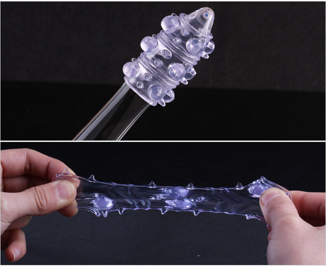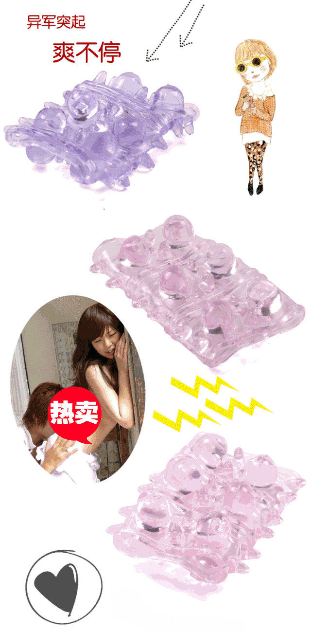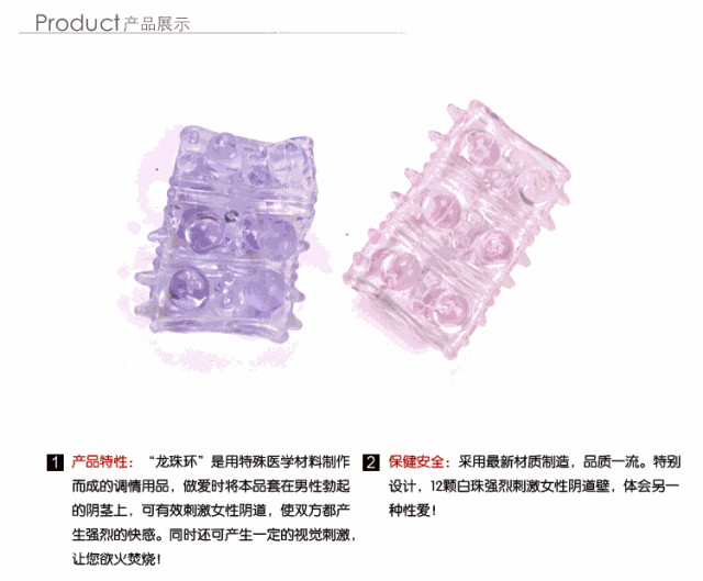 外觀小巧玲瓏,晶瑩剔透,表麵上有錯落有致大大小小的突起珠珠,剛柔並進,彈性極佳,套於陰莖根部,鎖住血液回流,有效延長陰莖勃起時間與增加硬度,浮點彩珠加強刺激女性敏感區域。本產品適合各種陰莖使用。在調情時,可戴在手指上、套上跳蛋上,或者套在小巧的振動棒上,按摩女性敏感部位,可以使她快速興奮,增添房事情趣。(也可以套在龜頭和冠狀溝附近作為包皮阻復環使用 效果明顯)