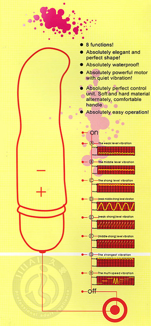 本品由最新進口軟矽膠精製,小巧,防水,並有全新的8種震蕩模式,底部單鍵操作。4種可愛色澤(淺紫、燦黃、艷紅、粉桃),是追求時尚、刺激的女性最佳首選產品。他們的狂放不羈、不束形骸、肆無忌憚的大膽狂跳征服瞭所有女性,讓您在最激情澎湃、洶湧難擋的瞬間達到性巔峰。(使用2節7號電池)