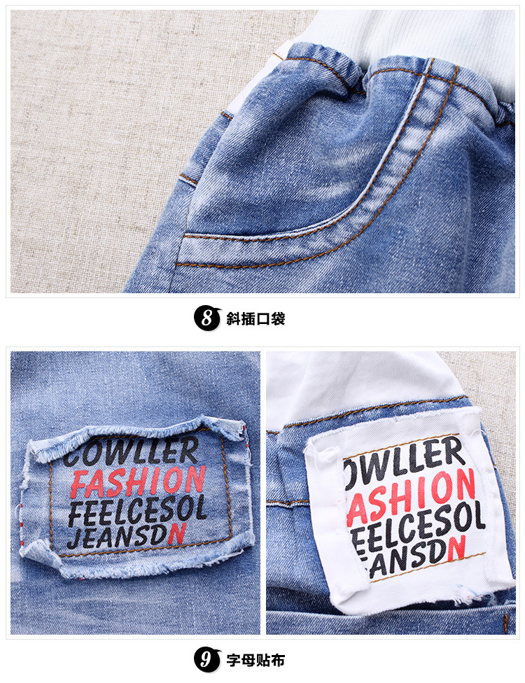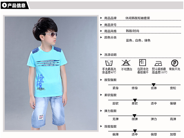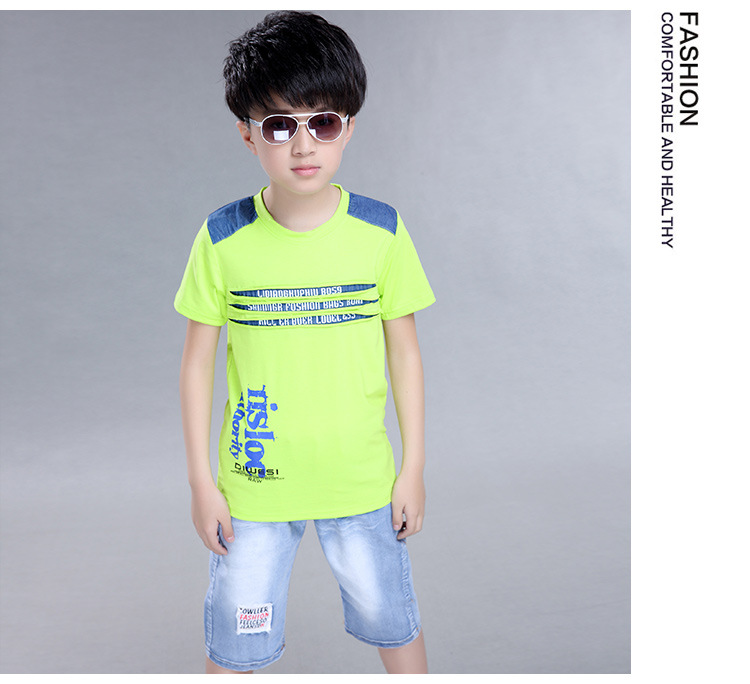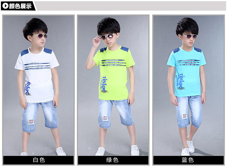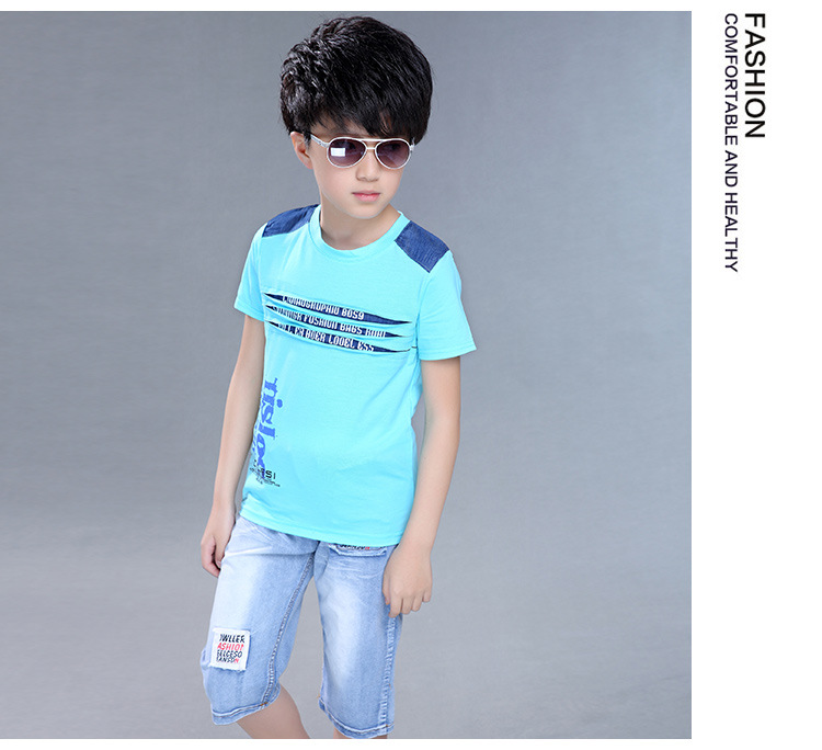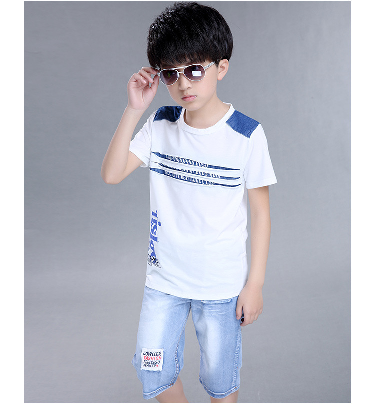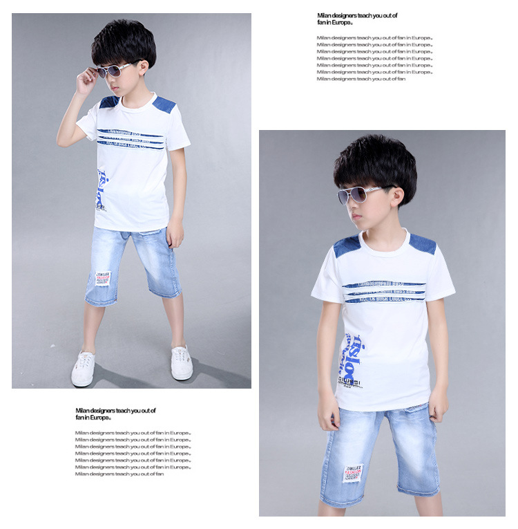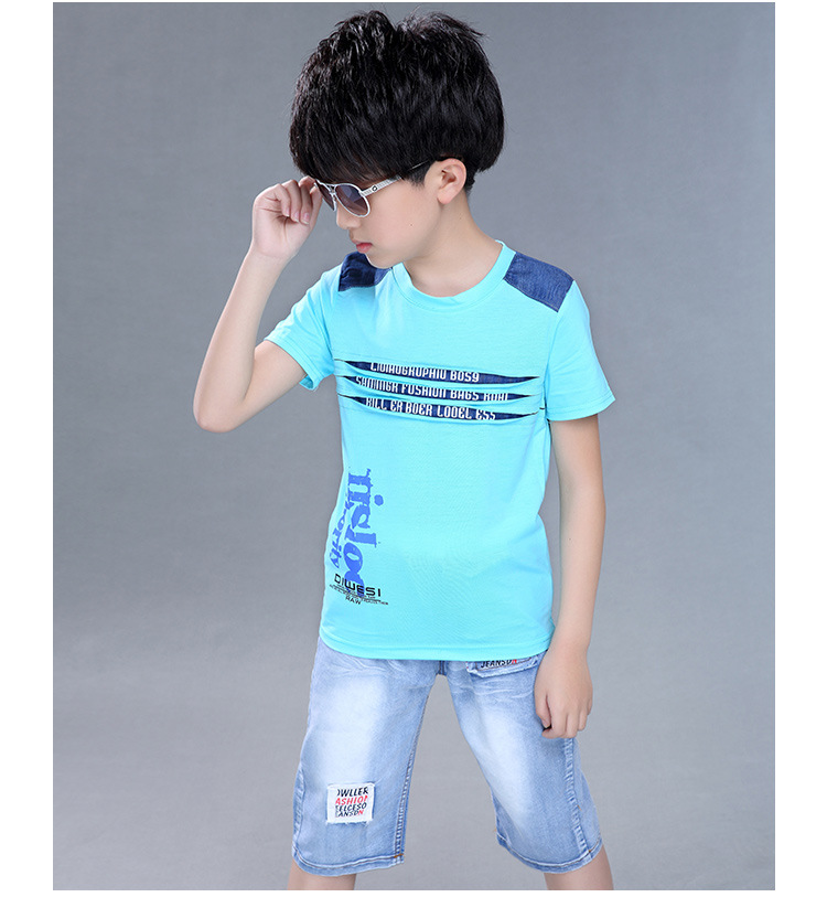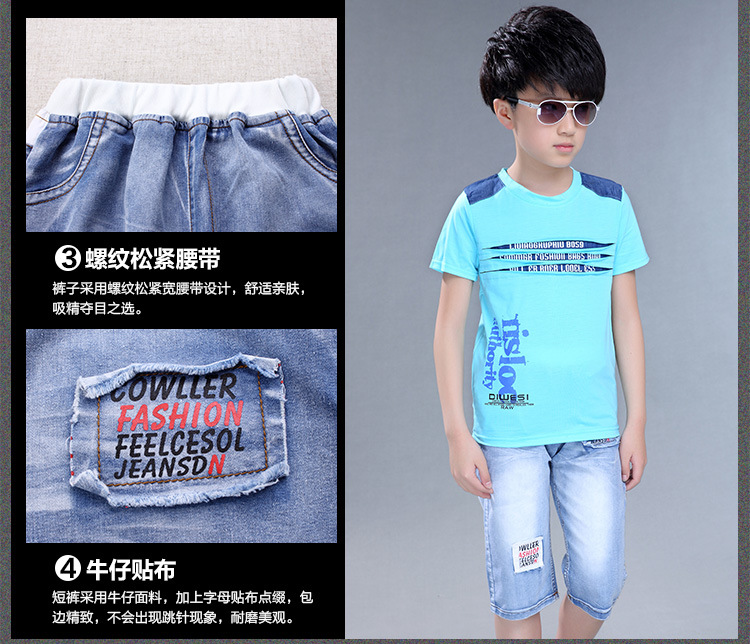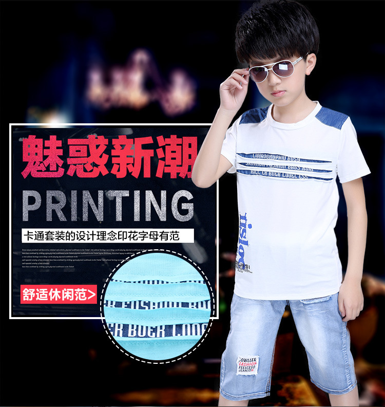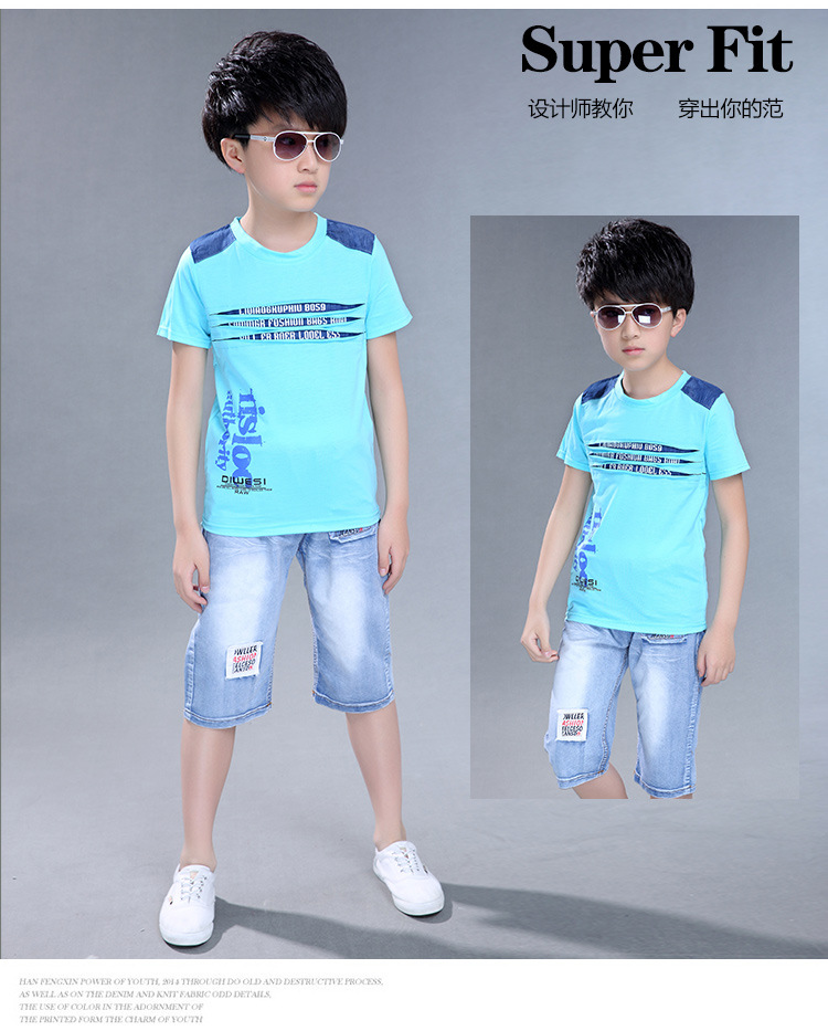 2016新韓版童套裝男童夏裝牛仔字母兩件套中大童兒童套裝一件代發