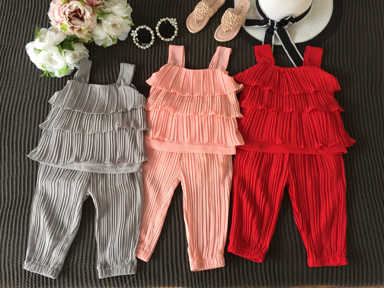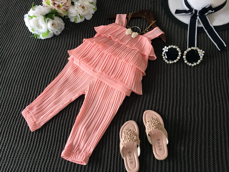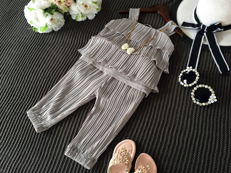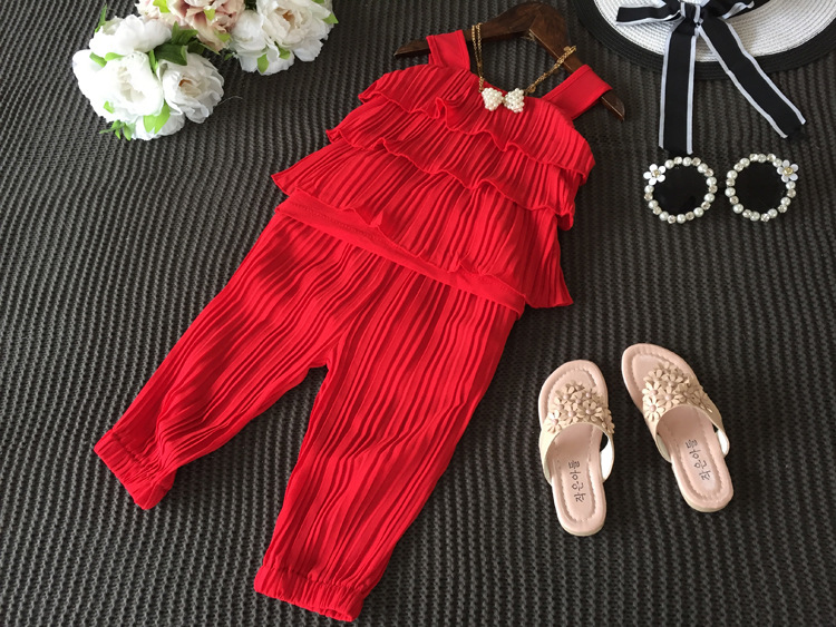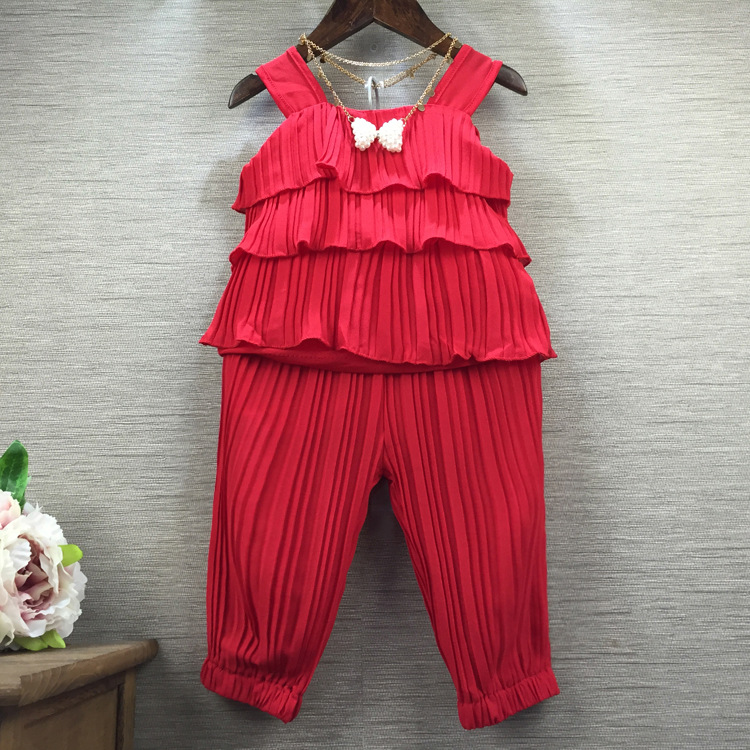 2016新款套裝 童裝批發 女童荷葉邊吊帶+褶皺燈籠褲兩件套XP-086V