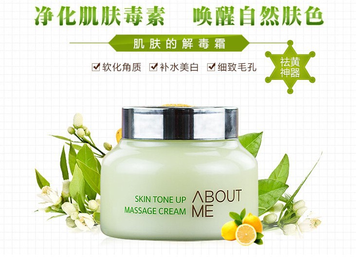 韓國頂級研究所出品~about ME是在韓國有90年的企業歷史的~三養集團直接經營的化妝品及保健品之統籌管理品牌主要產品包括基礎化妝品和排毒~補充膠原蛋白等體內美容保健產品~推薦他傢明星產品~ 獲得過2014年大韓民國消費者信賴代表品牌大獎~about me 按摩霜通過檸檬排毒膠囊排出皮膚內部毒素 一開始按摩的時候會覺得皮膚緊繃的感覺,這時候耐心 繼續輕輕打圈按摩,大約三分鐘左右,按摩霜的營養成分會被肌膚吸收,按摩的時候慢慢變成油狀感,這個時候繼續輕輕按摩約兩分鐘後,用濕紙巾或者潔麵海綿撲將皮膚上剩餘的物質輕輕擦掉,驚奇的會發現黃色的物質有些人用的時候還會有點發黑,那個便是通過按摩排出的毒素~第二天皮膚變白還很細膩!真心好用!味道是很喜歡的檸檬味!推薦~!