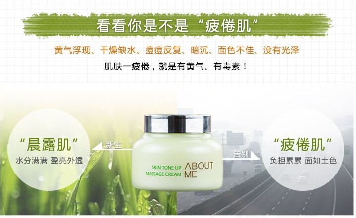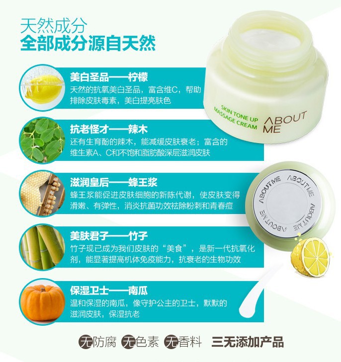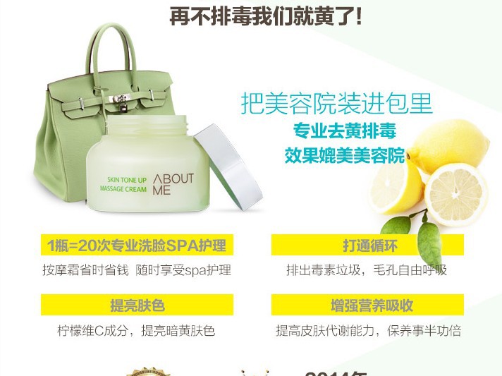 韓國頂級研究所出品~about ME是在韓國有90年的企業歷史的~三養集團直接經營的化妝品及保健品之統籌管理品牌主要產品包括基礎化妝品和排毒~補充膠原蛋白等體內美容保健產品~推薦他傢明星產品~ 獲得過2014年大韓民國消費者信賴代表品牌大獎~about me 按摩霜通過檸檬排毒膠囊排出皮膚內部毒素 一開始按摩的時候會覺得皮膚緊繃的感覺,這時候耐心 繼續輕輕打圈按摩,大約三分鐘左右,按摩霜的營養成分會被肌膚吸收,按摩的時候慢慢變成油狀感,這個時候繼續輕輕按摩約兩分鐘後,用濕紙巾或者潔麵海綿撲將皮膚上剩餘的物質輕輕擦掉,驚奇的會發現黃色的物質有些人用的時候還會有點發黑,那個便是通過按摩排出的毒素~第二天皮膚變白還很細膩!真心好用!味道是很喜歡的檸檬味!推薦~