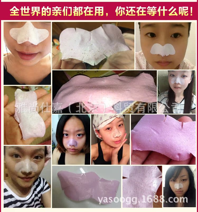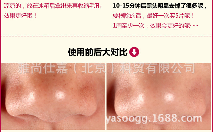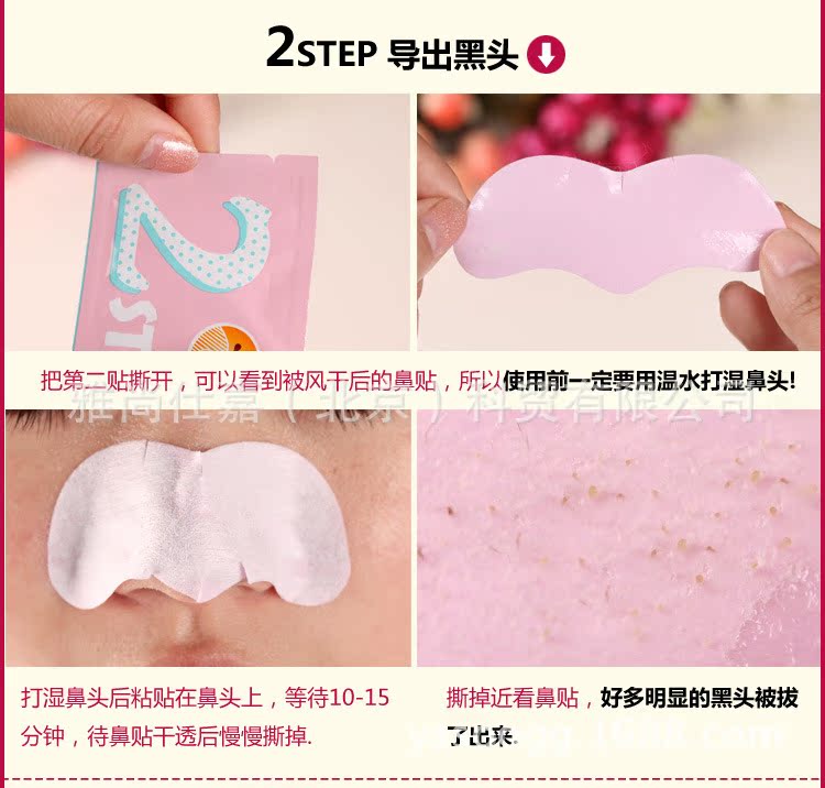 2. 浸濕鼻子,取出第2粉色貼 ,揭下塑料膜將鼻貼粉色麵貼於鼻頭部位,等待10~15分鐘左右,待鼻貼完全乾後,慢慢揭掉。