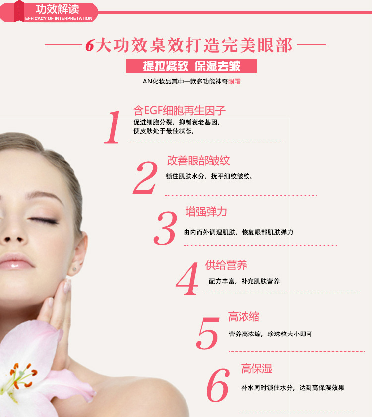 功效:用植物提取的氨基酸合成所需分子結構,並用分子結構增加皮膚內的膠原蛋白,因而改善皮膚皺紋,並起到治愈傷口再生皮膚作用