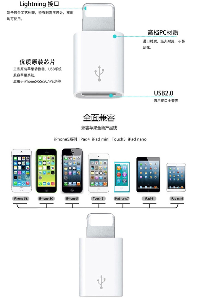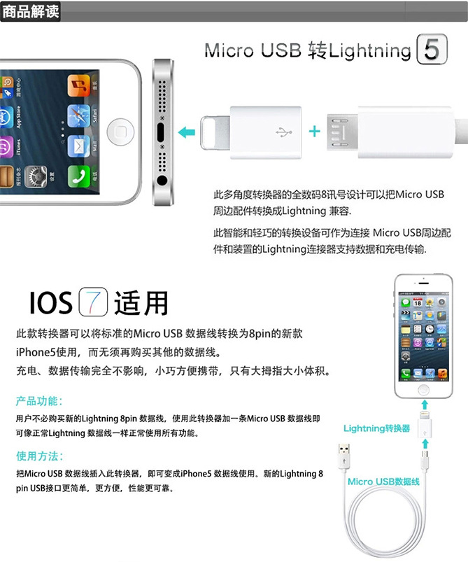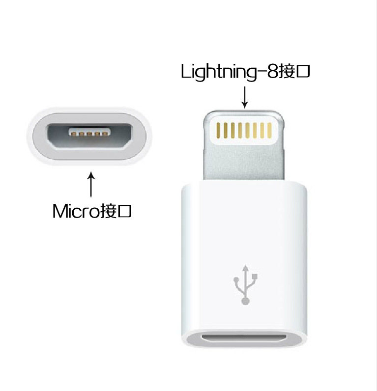 - 功能:轉接後適用蘋果5代、6代系列,支持Apple 8.0及數據同步和充電功能
