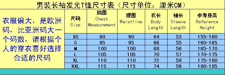 我們的秋裝長袖男裝T恤是根據歐碼的標準做的,衣服會比亞洲碼稍大,請親們核對清楚尺寸表胸圍,腰圍才下單或者詢問客服給予建議。請不要隻看參考身高,要不然衣服容易買大或者買小。