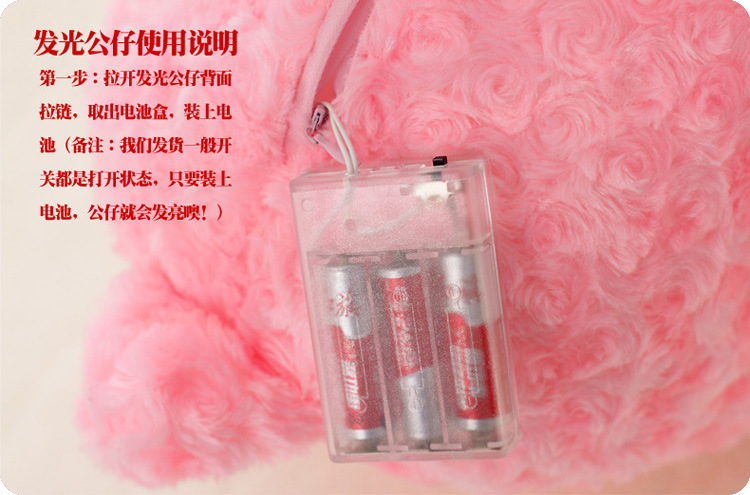 使用方法:先拉開右下方的拉鏈→取出電池盒子,推開電池盒蓋,按正確方位壓入3節5號電池→蓋上盒子→扳動電池開關到ON位置→打開娃娃右手上的開關即可!可以持續用30個小時!(超省電)