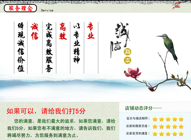 1、我們堅持提供高品質貨源,拒絕差質量,上不瞭臺麵的劣質貨。我們不做一錘子買賣。因為我們相信:隻有產品做好瞭,才會有回頭客。不管是網店銷售,還是實體經營,都需要好品質,做淘寶的人都知道,評價對於一個店鋪來說那是相當重要的,難道您喜歡被客人差評,難道您喜歡被繁瑣的售後折騰嗎?對做實體的來說,客人的眼睛都是雪亮的,質量不好,做工粗糙他們會要嗎?不會去貨比三傢嗎?