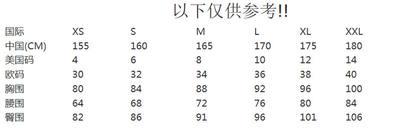 溫馨提示:尺寸表僅供參考,有適當誤差,純屬正常范圍,若無法確定也可以聯系客服為您推薦合適的尺碼