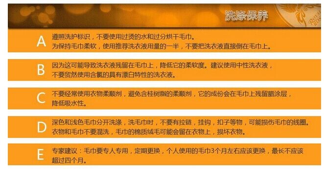 因此如果您發現毛巾有粘滑感並伴有惡臭味,應該盡快用肥皂洗凈並晾曬於通風處。新生產的毛巾一定要退漿,乾透、冷卻後在打包存放,切不可在潮濕悶熱的環境下存放過久,以免發生黴變。