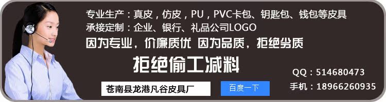本廠是一傢專業生產廣告促銷禮品的廠傢。主營產品:卡包,名片包,鑰匙包及皮具禮品套裝等。