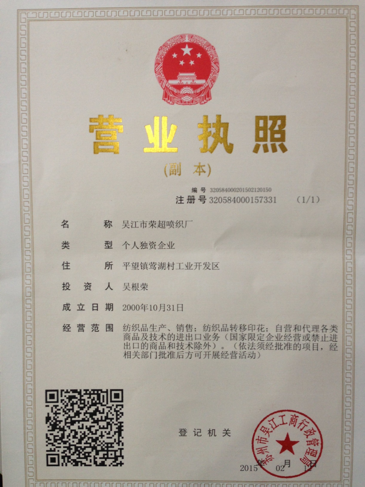 - 本廠成立於2000年,坐落於絲綢之都江蘇吳江市平望鎮南開發區227省道南斯加油站旁,地處滬、蘇、杭的金三角中心,南接杭州、北倚蘇州、東臨上海,地理位置優越,交通便利,通訊發達。是一傢集生產織造與貿易為一體的綜合性企業。 本工廠占地平方20多畝,現有噴水織機若乾及進口設備若乾,主要以生產經營化纖類麵料佈及裡料佈:桃皮絨、超細纖維錦滌雙麵絨……適用於浴衣浴袍、沙灘巾、運動毛巾、沙發麵料、汽車座套、星級酒店會議桌臺尼(臺絨)佈、清潔佈等等;各種後整理如:仿水、壓花、復合TPU膜及T/C底佈、透氣透濕、吸濕排汗、刮膠、印花、燙金等。公司擁有一大批穩定的客戶群和健全的營銷網路。公司始終把確保產品質量、提供優質服務、加強經營管理放在首位,不斷探索,勇於創新,恪守“追求品質,締造完美”的經營宗旨,堅持“重合同、守信用”的原則,為客戶提供可靠的產品質量和保證。竭誠為海內外客商提供優質服務。