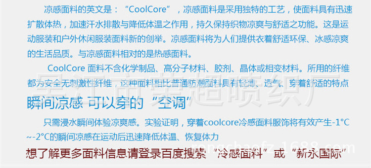 COOLCORE(製冷核心技術)是美國專利冷感麵料,適用於涼感麵料適用於內衣麵料、襯衫麵料、床上用品麵料、登山服、高爾夫服裝、休閒系列服裝麵料、各種服飾麵料、傢用紡織品麵料、體育、軍事、醫療等紡織品行業,是抗暑降溫的冷感科技麵料。已研發成熟的冷感麵料系列產品,包括運動服、運動用防護用品及跌傷治療用具等,不僅能增加運動過程舒適性、安全性,更能幫助運動員在運動後迅速降低體溫、恢復體力。COOLCORE冷感麵料隻需浸水瞬間體驗涼爽感。