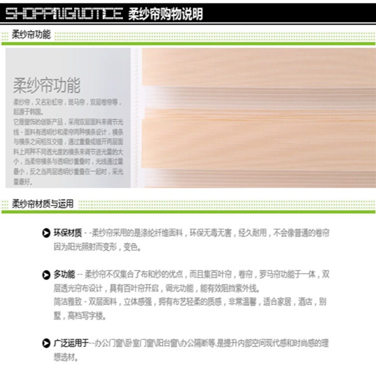 特別提醒:柔紗簾的製頭寬度大約有1.5cm,因此麵料的寬度會比窗簾的寬度短2cm左右,也就是說如果裝在窗框內,那兩邊就會有一定的空隙,這是柔紗簾的結構決定的,或者買回去是用在臥室和衛生間等私密性高的環境的買傢,請慎重考慮,也可以考慮把它裝框外,這樣可以避開兩邊的空隙。