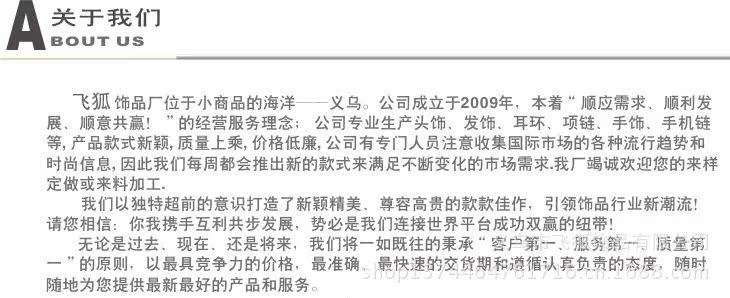 關於我們:我們是 自主研發的生產廠傢。專註於網路暢銷飾品的開發生產,我們價格最低質量最好,占據淘寶活動水晶飾品類80%市場份額。是中國最大的專業網路暢銷款式水晶飾品生產廠傢。