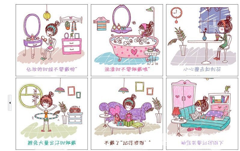 2.接觸化學藥品,飾品最易受損。避免飾品直接接觸清水、香水、皂液、美發噴霧劑、樟腦丸、洗潔晶等帶有化學成分物品對飾品的侵蝕。切勿於睡覺、沐浴、遊泳或作劇烈運動時佩戴飾品。沐浴時的香氣、遊泳中的氯氣、海水中的鹽份,都會對首飾造成一定的腐蝕,所以洗澡或遊泳前應將飾物全部卸除。