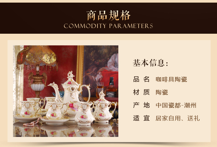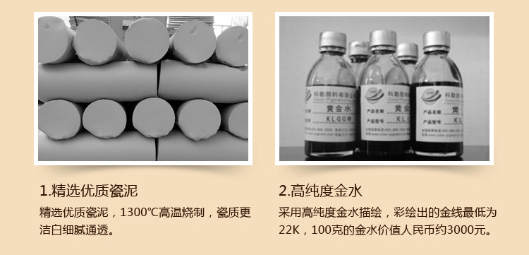 - 產品特點:新時代傳統以及全新工藝定義,產品的獨特,全手工描金裝飾,清新、大方、簡約、時尚,適合各種現代化的傢居的好裝飾品。本瓷二廠主要生產銷售歐式工藝產品,以及酒店、KTV、夜場系列,所有產品均為綠色產品,安全,無鉛無毒,無任何污染。高檔象牙瓷:色如象牙般,瓷麵中帶著微黃般的色彩,硬度較高,色澤較好,其質也如象牙般細密、潤滑,該產品采用特殊工藝式燒製而成,在瓷器中的尋找新的品種。本廠出售的所有產品均采用純手工的描金工藝。所描金度高達百分之15的黃金油以及手藝精湛的專業手繪的手工師傅,攜手為我們打造最華麗的高檔宮庭式象牙精品,享譽世界