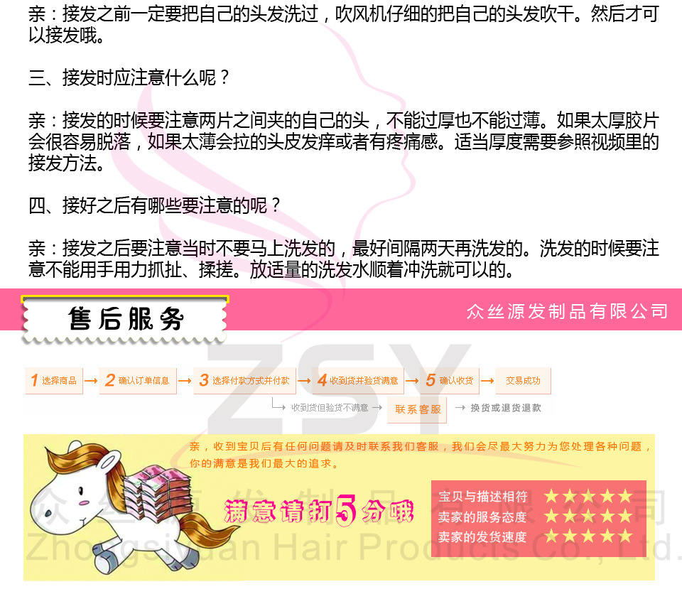 3.在使用洗發、護發產品時用註意不能用含酒精,油及乙醇成分過多的產品,這樣會使膠條脫落或髮絲顏色褪色,如果打結請使用專業的柔順劑,可以讓頭發柔軟如絲。