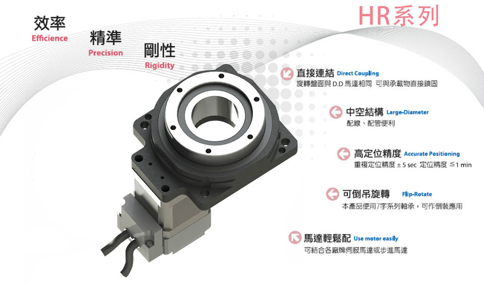 - 高定位精度,重復定位精度±5arcsec ,定位精度≦1arcmin ,盤麵與D.D馬達相同,可與承載物直接鎖固。