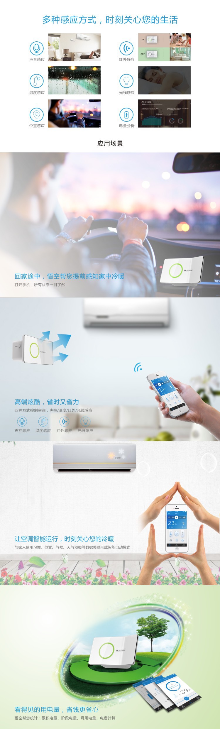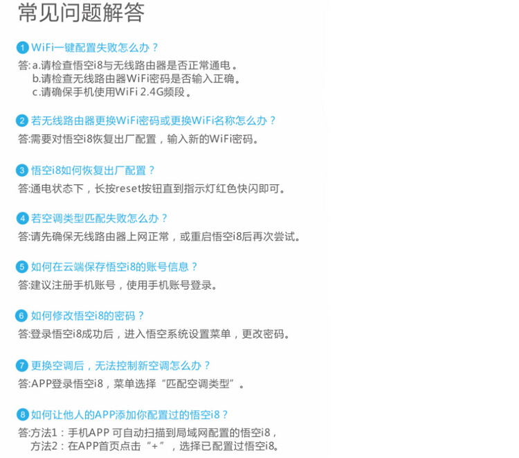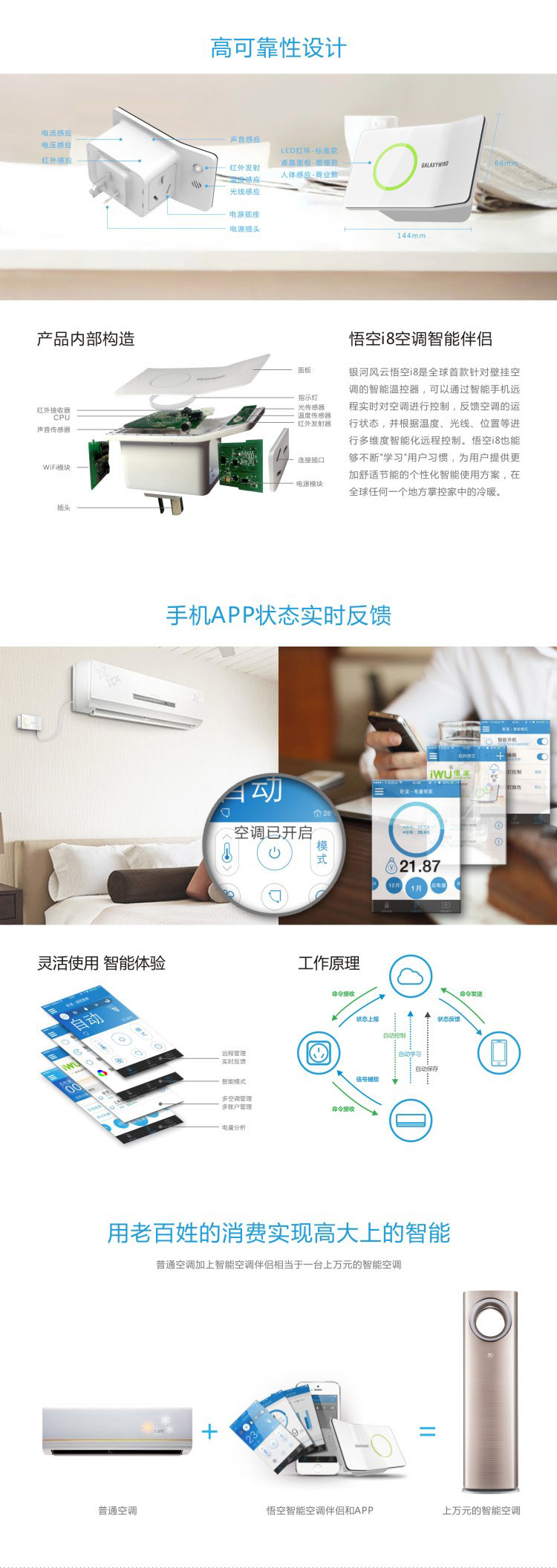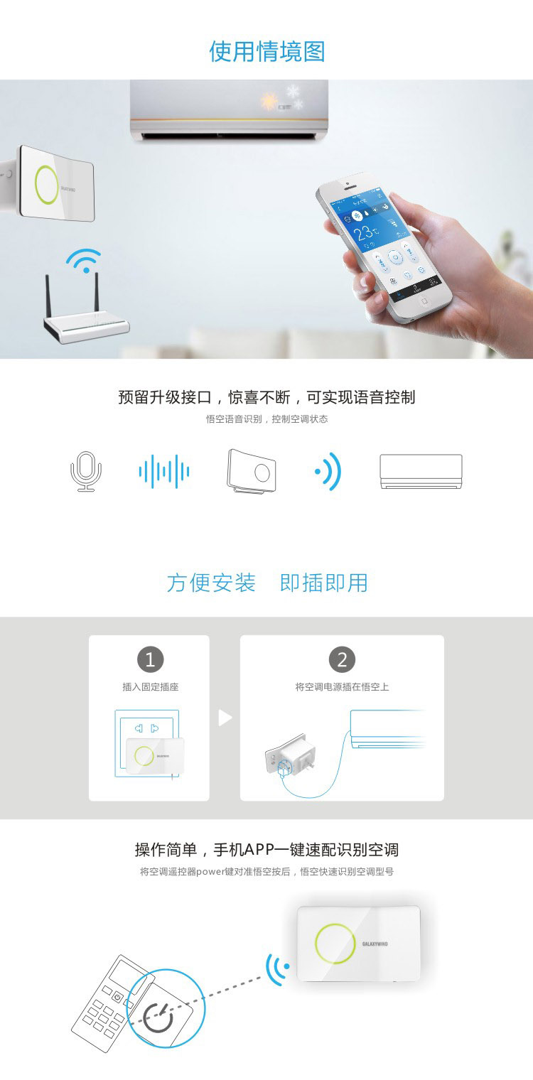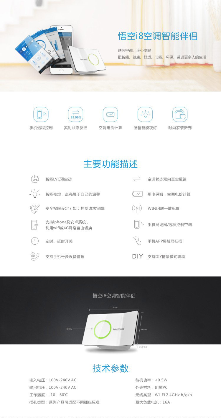 ———————————————————————————— 產品介紹 ———————————————————————————— 悟空i8系列WiFi智能插座是公司新款物聯網空調溫控器產品,為傳統型分體式壁掛空調實現安全、實用、便捷的智能化升級。可以通過APP遠程智能控製空調的開關、溫度、模式,並向APP實時反饋空調運行狀態與電量使用報表。