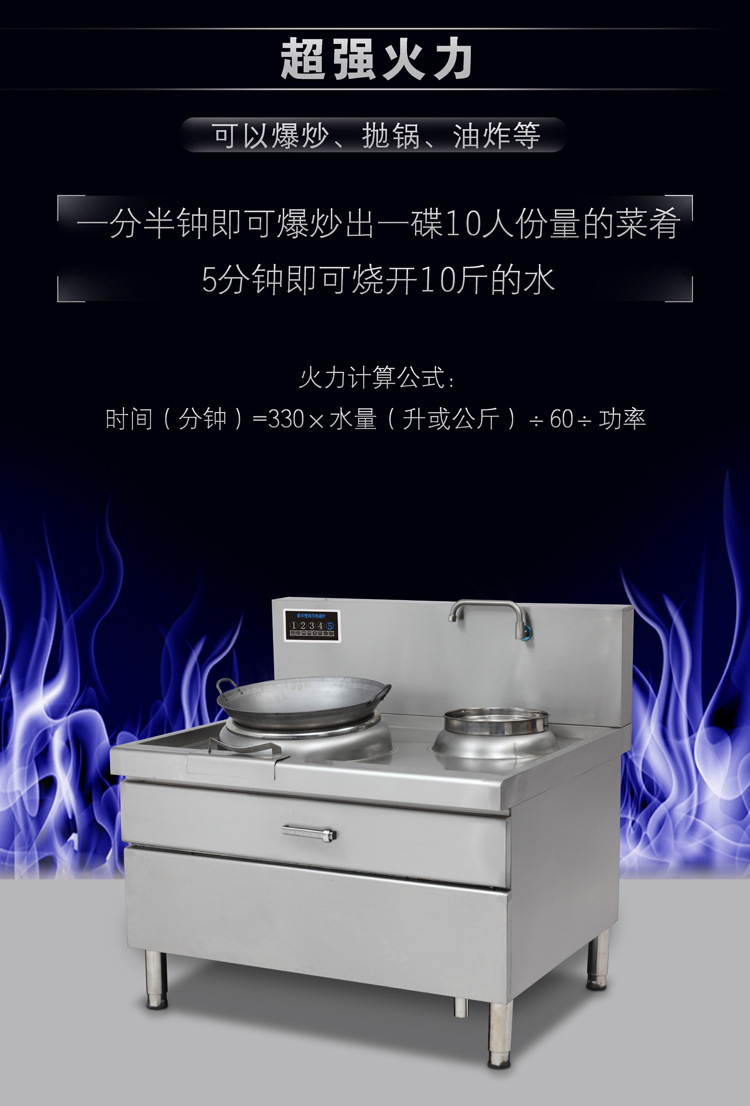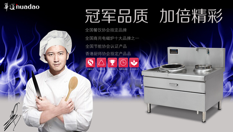 東莞市華道節能科技有限公司主要以研發、設計、生產銷售:商用電磁大炒爐,商用電磁大鍋灶,電磁大炒爐,電磁大炒鍋,電磁大鍋灶,全自動煮麵爐,電磁蒸飯櫃,電蒸櫃,電磁煲湯爐,電磁小炒爐等電磁產品的一傢優質專業商用電磁爐供應企業;產品特點:高效、節能、環保、安全、衛生、無有害氣體排放等優點完勝傳統廚房燃氣燃油灶具。是新型高科技節能環保廚房的代表產品。中式餐廳大功率商用電磁爐 可拋炒單頭單尾12KW電磁小炒爐灶批發