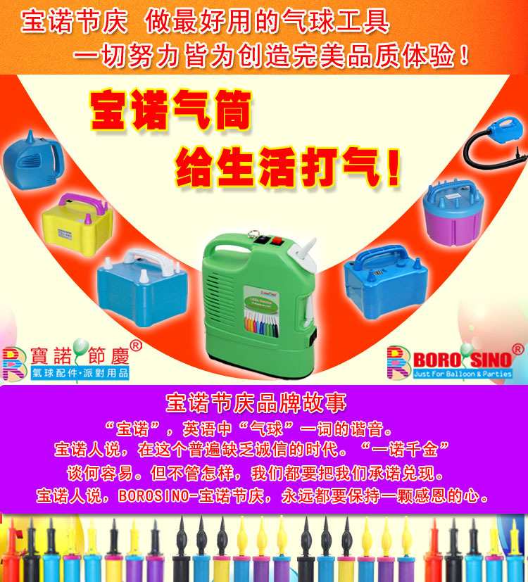 東莞市寶諾節慶用品有限公司是一傢經國傢相關部門批準註冊的企業。公司致於打造氣球配件、充氣泵、打氣筒及其它配件於一體的節慶用品和派對用品專業的廠商,公司產品有多年的出口經驗,產品質量可靠。