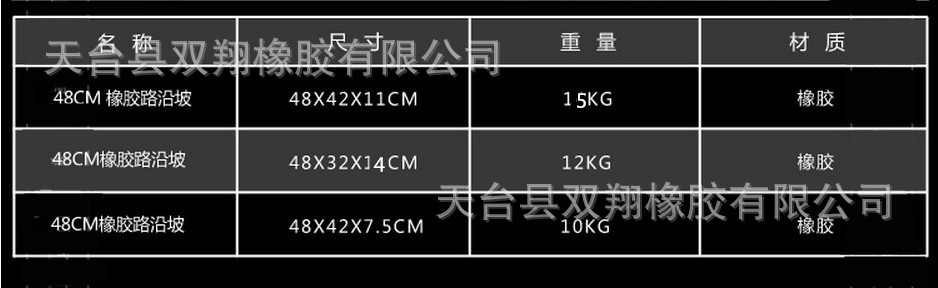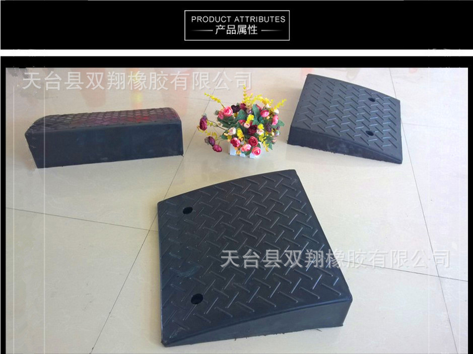 路沿坡(路斜坡)采用優質橡膠製作而成,產品堅固耐用,耐壓持久壽命長,對車的磨損少,無噪音,減震性、抗壓性極好,主要用於消除踏步高差阻礙。