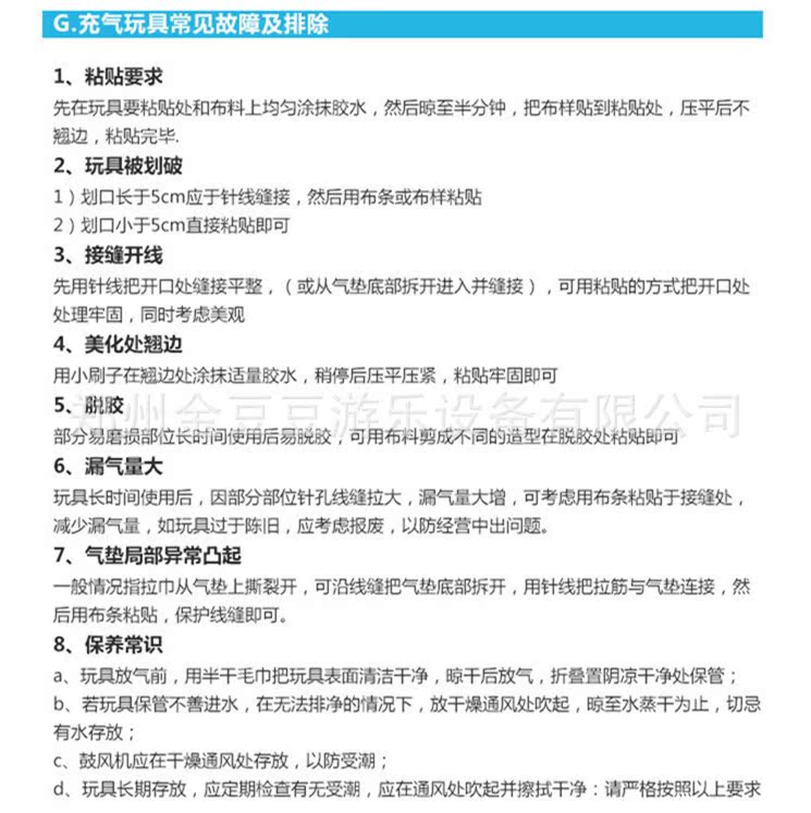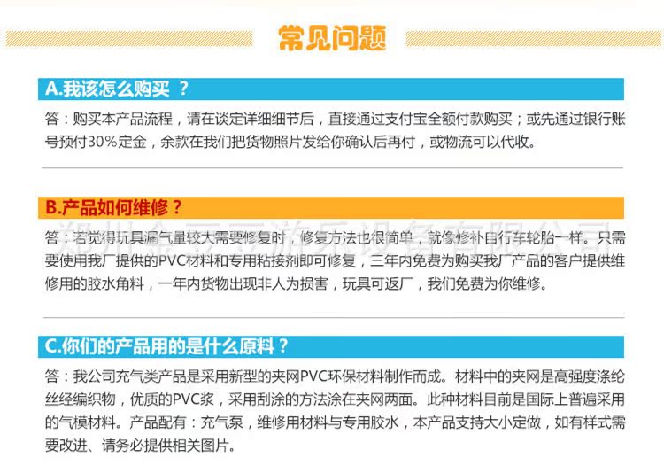 - 材 料: 0.7加網PVC佈料,由質量監督局檢測結果顯示此材料對皮膚無刺激性,無毒性對兒童完全沒有傷害。此材料為一種專業的充氣佈,耐寒性好,阻燃性好。