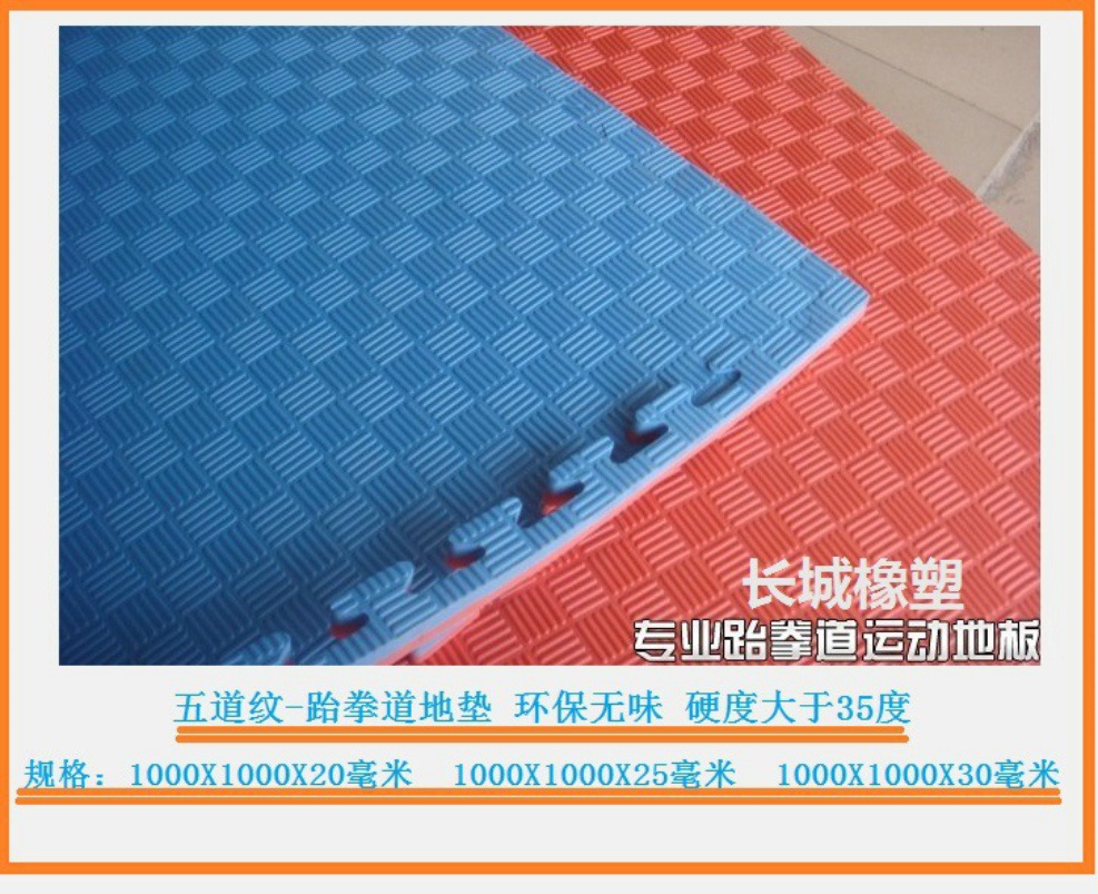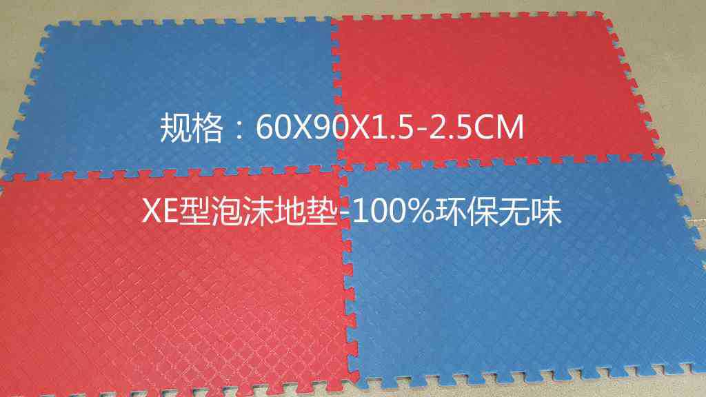 三、使用場所:跆拳道場館、客廳臥室、學校幼兒園、兒童房、健身房、體操房、運動健身場館、遊樂園等。 四、產品特性:本系列產品采用優質(PE聚乙烯)100%環保新材料,回彈性好、隔音減震、無毒無味,色彩絢麗,雙麵花紋清晰易清洗,美觀耐用。