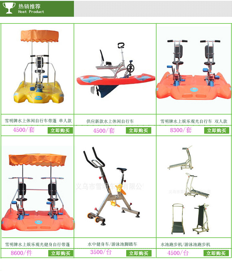 雪明牌水上自行車/水上腳踏車/水上遊藝設備/水上公園娛樂設備/水上休閒運動設備/戶外水上娛樂用品。 本產品有外觀設計專利,偽冒必究。另有CE證書。 PE環保船體,鋁合金車架,不銹鋼鏈條,安裝簡單,方便運輸和儲存。 |