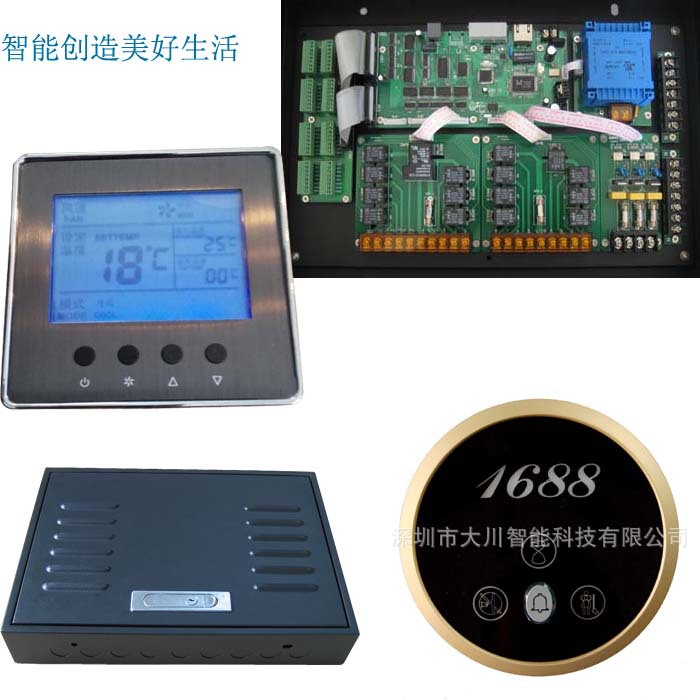 空調控製主要通過智能客房控製器對中央空調及采暖系統的風機盤管、電磁閥的控製來實現對室內溫度的控製。溫控器采用大屏幕液晶顯示,通過溫控器內部的數字溫度傳感器,能夠準確檢測出室內真實溫度。並能實時地與用戶所設定溫度進行比較,自動調節冷暖氣的進氣量或控製管道電動閥,達到保持室內恒溫的目的。
