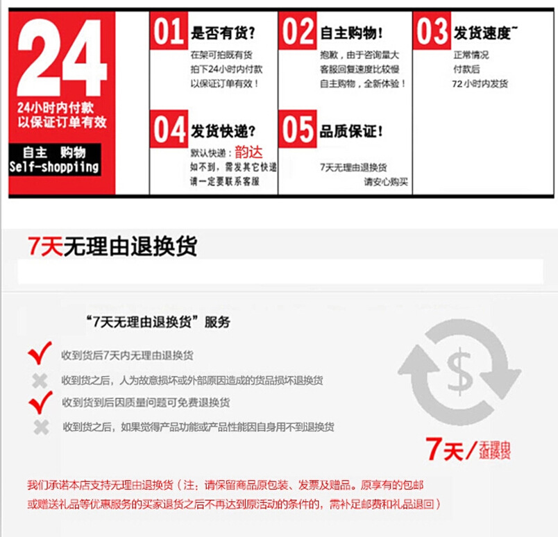 因產品質量問題造成的退換貨,本店承擔所有責任及其所發生的任何費用;如拍後因買傢自身問題退貨,請提前告知店主,因非質量問題造成的退換貨,將由客戶您承擔所有責任及其所發生的任何費用。退回時請務必保證寶貝的完整(包括塑料袋,盒子的完整),且不影響二次銷售,會為您辦理退換貨手續!