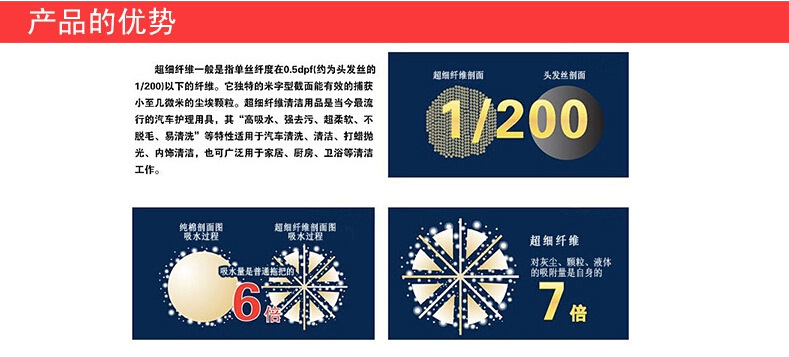所謂超細纖維是指直徑隻有0.4mu的微纖維,其纖維度為真絲的1/10特別楔形橫截麵,使它有效地從擦拭物表麵捕獲甚至幾微米的塵埃微粒,其最大特點是快速乾發、吸水性強、去塵埃去油除污效果十分明顯,它不會滋生細菌、不會發黴、不腐爛、不起球、不掉毛,同時它具有極強的抗老化性,它是棉製品壽命的5倍,吸水量是棉的7倍。
