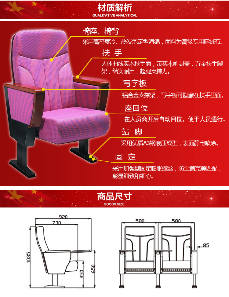 定型座背綿:采用高密度冷、熱發泡定型海綿一體成型。 麵 料:高級專用麵料,抗污、耐磨、防褪色。 膠 殼:采用優質PP(聚丙烯)多元素復合材料經模具壓鑄成型。 扶手麵:優質進口原木加工,外塗環保聚酯油漆;手感舒適,美觀耐用。 寫字板:鋁合金支撐架+高密度防火寫字板,方便快捷。 站 腳:優質A3鋼板液壓成型,設計符合人體工程學原理,安全舒適。 座回位:采用彈簧或重力自動回位方式。 適應場所:禮堂、會堂、法院、劇院、會議廳、音樂廳、學校、體育場館等場所。