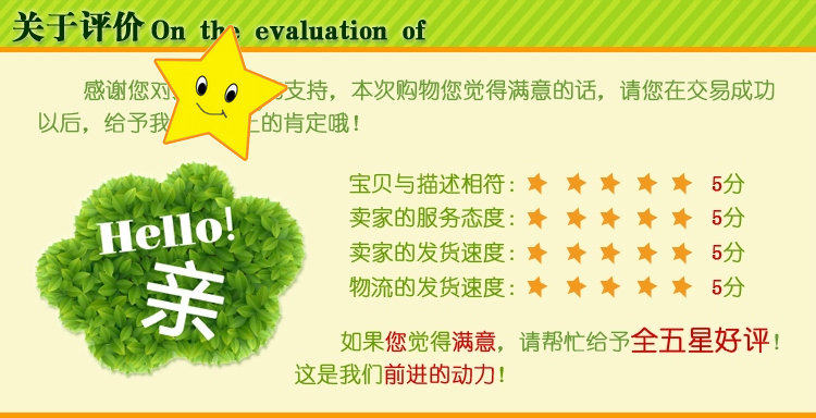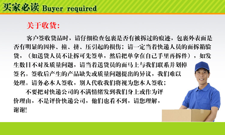 5.收貨簽收:當您收到包裹時,一定要當著快遞的麵檢查包裝是否完好,包裝有無破損,確認無誤後在簽收。如發現貨物缺少,數量不符,破損等問題,請立即電話聯系我們,確認無誤後在簽收!謝謝。由於每個地方的快遞服務素質良莠不齊,有可能會給買傢帶來不必要的麻煩,如有任何不滿意的地方,請您告訴我們,我們會及時為您處理,給親一個滿意的答復,謝謝!