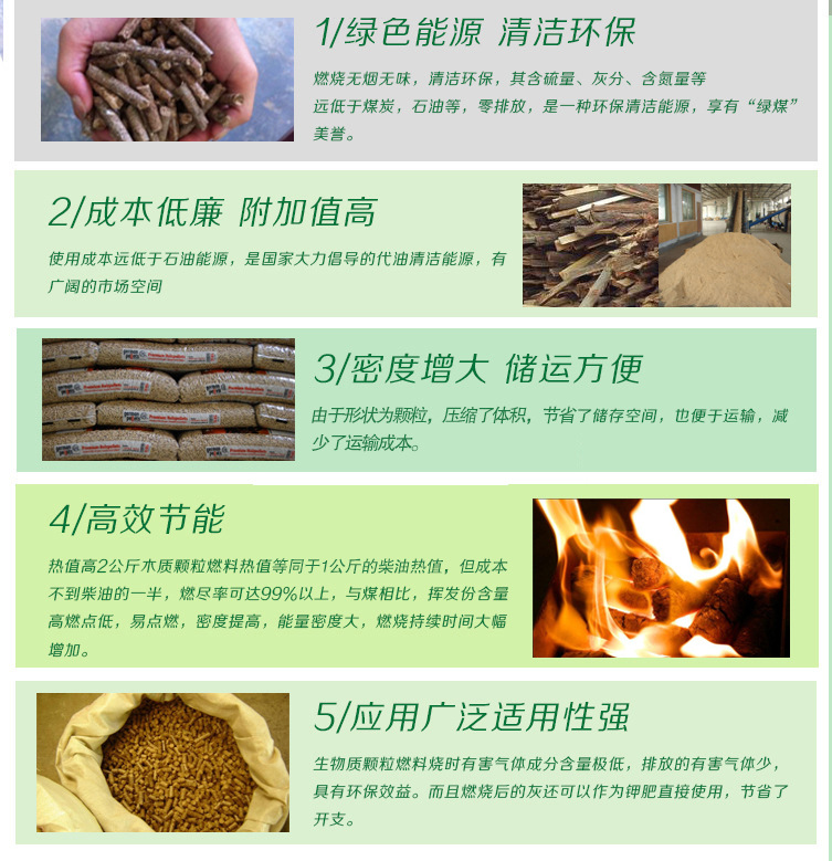 4, 由於生物質顆粒燃料不含硫磷,燃燒時不產生二氧化硫和五氧化二磷,因而不會導致酸雨產生,不污染大氣,不污染環境。