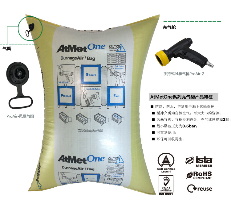 | 充氣保護包裝系統“Dunnage Air”,可適用於各種運輸環境,是位於美國亞特蘭大的AtMet Group設計,通過Atmet位於中國上海的工廠製造。 AtMet Dunnage Air不僅是一種環保型可重復使用的包裝緩沖物,其獨有的專利技術——ProAir“風暴”快速充氣系統更可以為用戶大大節省操作時間,降低物流成本。 由AtMetOne、AtMetOne+、AtMetZero組成的系列產品通過最嚴格的美國鐵路運輸協會AAR認證及SGS重金屬檢測,AtMet不僅是國際安全運輸協會(ISTA)會員,更是中國國傢充氣袋行業標準的起草者。 作為亞洲最大的充氣袋生產商,AtMet的產品被廣泛應用於各個行業的運輸保護中。 我們不僅提供一流的產品,更提供專業的運輸保護包裝的設計、培訓及現場服務。 |