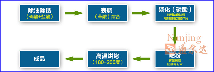 9.貨架各部件加工好成型之後全部經打磨、酸洗、磷化、全自動粉末靜電噴塗、烘乾等工藝處理後組裝成品。生產出的貨架成品表麵光潔、美觀;層板可上下任意調節,拆裝方便。