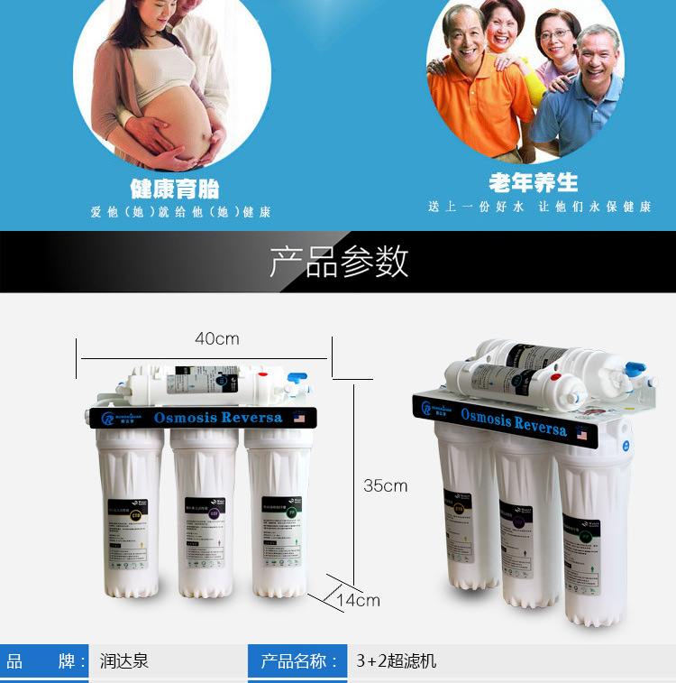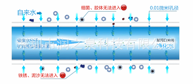 孔徑小於0.01微米的超濾膜能截留水中極微小懸浮物、膠體、顆粒、細菌、熱原,濾除水中大分子物質,濾後水清澈可口,可直接生飲。